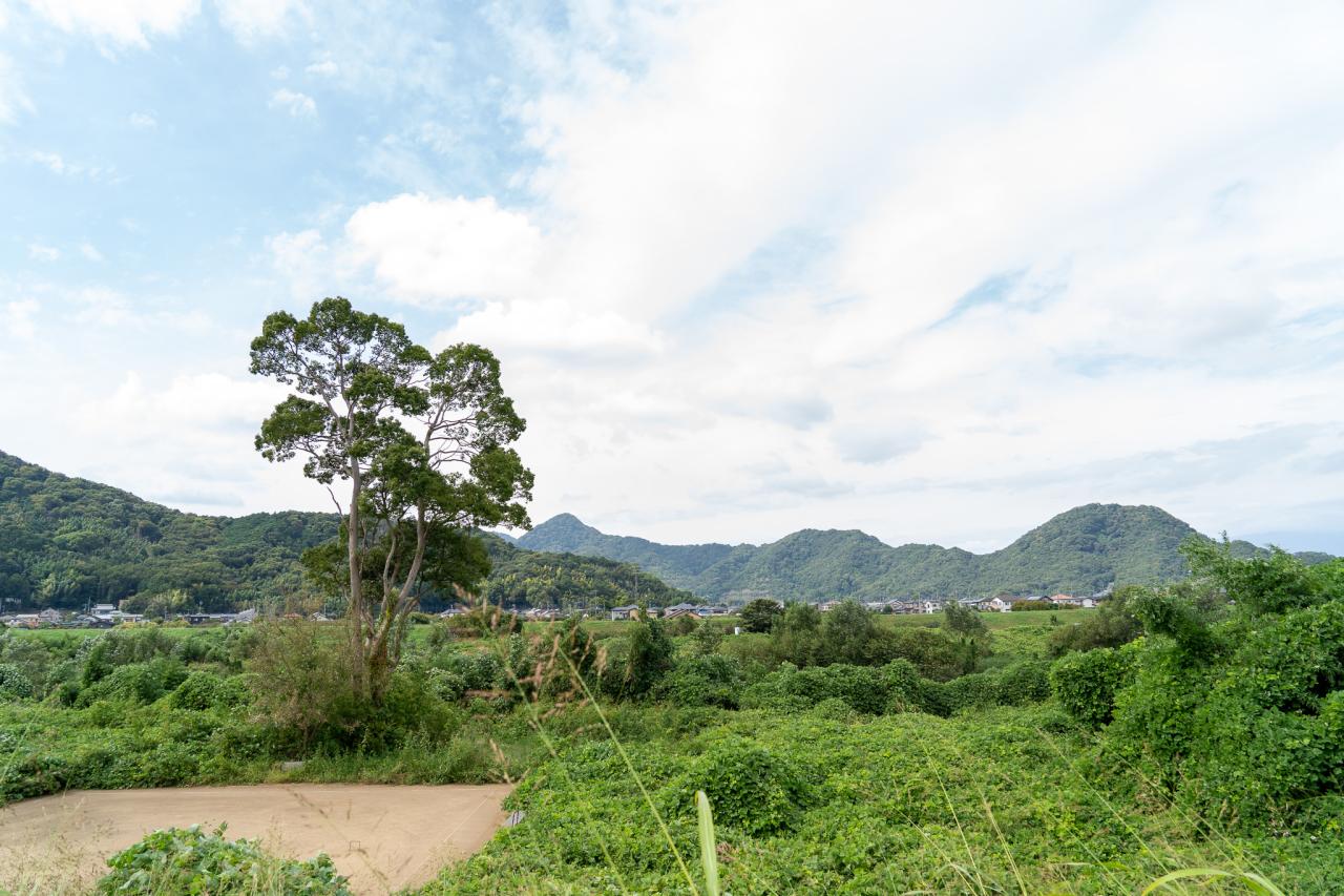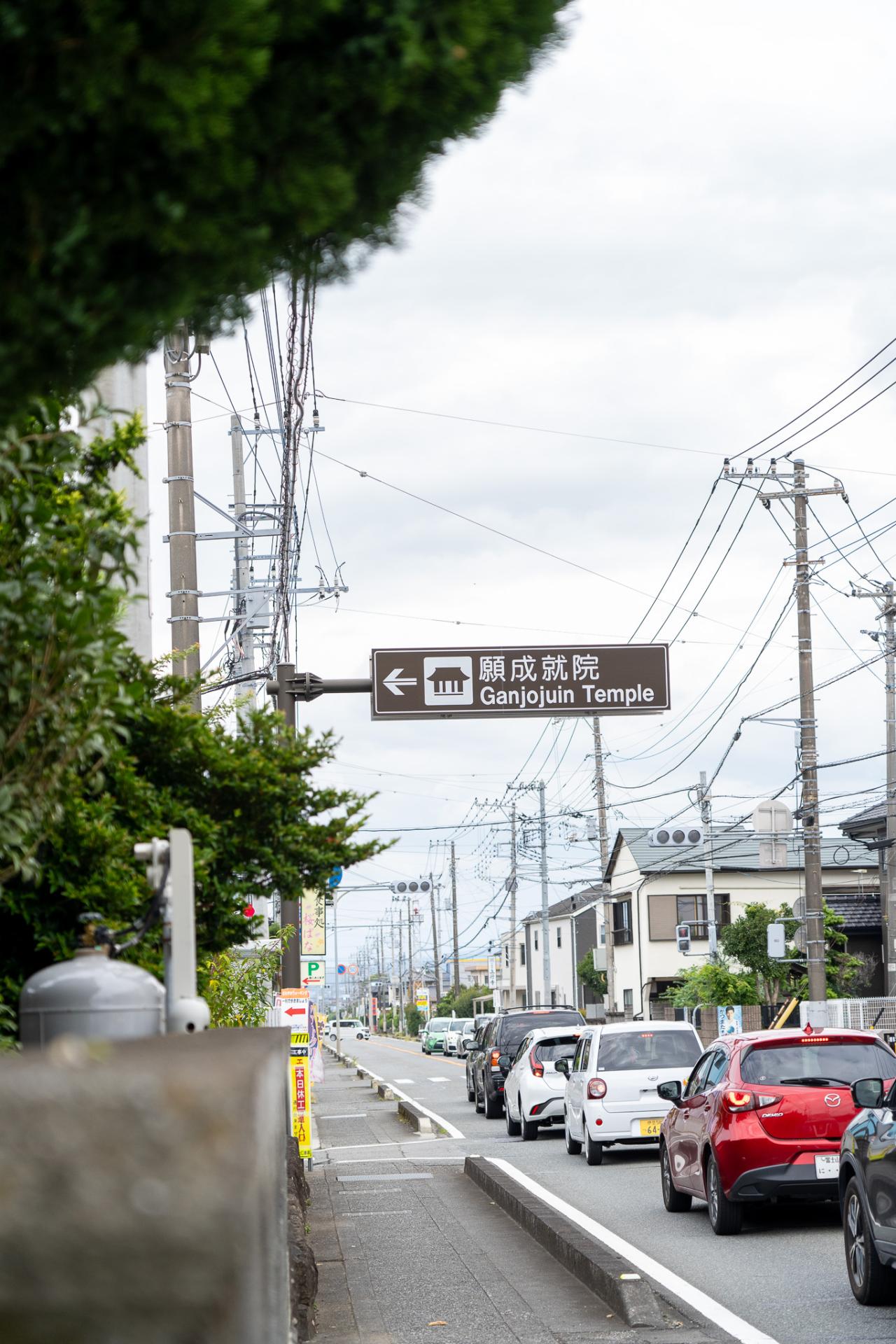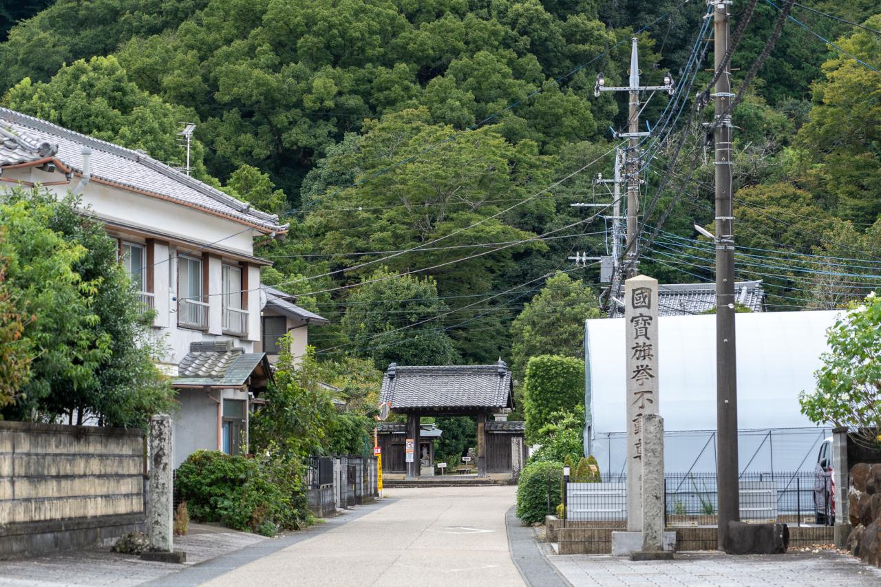 幹線を曲がると雰囲気が一変、正面の小高い山の山裾に願成就院の三門らしきものが見えます。