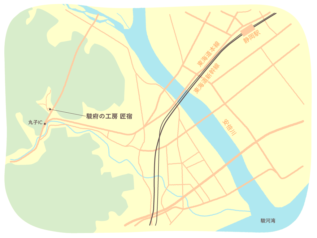 静岡駅から車で約15分ほど。丸子(まりこ)地区にある大型体験施設〈駿府の工房 匠宿〉が見えてきた。〈駿府の工房 匠宿〉は静岡の伝統工芸を伝える場所として1999年の4月にオープン。2021年5月には指定管理者の株式会社創造舎によって全面的にリニューアルが行われ、地元の伝統工芸をさらに盛り上げる施設として生まれ変わった。建築デザイン事務所の創造舎は施設の周りにも宿泊施設や飲食店を増やしていて、〈駿府の工房 匠宿〉を中心とした地域づくりも行っている。
