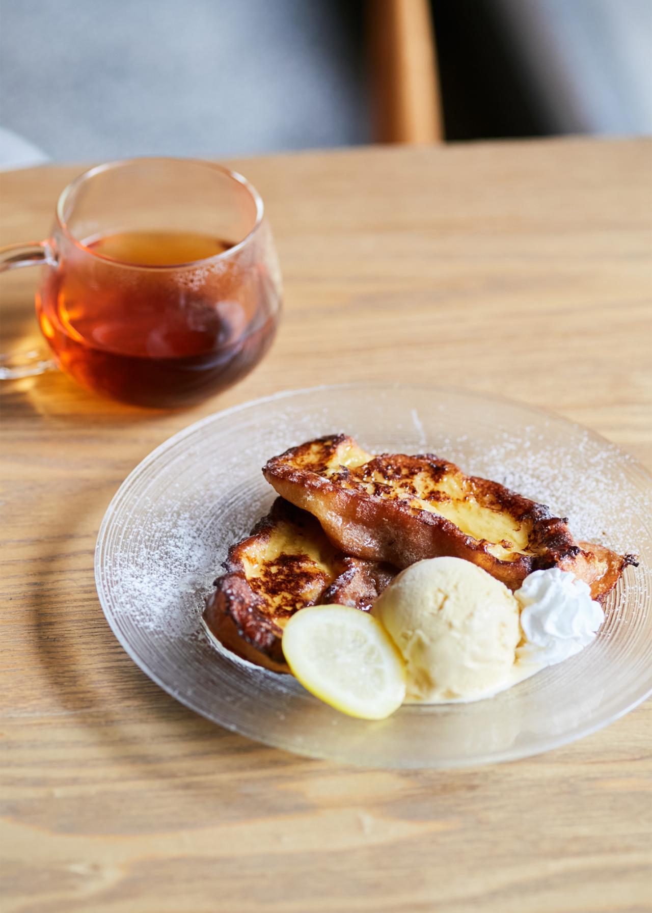 「昔は丸子地区で養蜂が盛んだったんです。ここでは季節や時期ごとに地元丸子のハチミツをさまざま用意していて、フレンチトーストやチーズケーキなどにたっぷりかけて召し上がれます。さらに、丸子地区は和紅茶発祥の地としても有名なんです。和紅茶のパイオニアとも言われた村松二六さんが、この地で栽培を始めたのがきっかけと言われています。ドリンクも豊富なのでぜひ味わってみてください」と話すのは店長の見城梢さん。