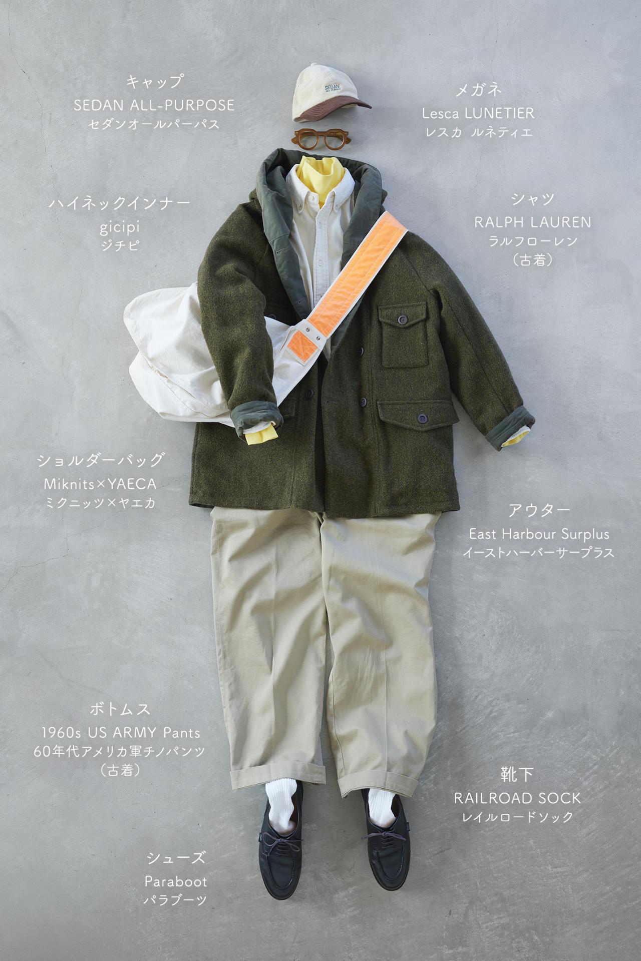 どこかに色を取り入れたくて、インナーとバッグに差し色になりそうなものを選んでみました。ちなみにこのバッグは新聞配達員さんが使っていたものがベースになっているらしいです。ショルダー部分の鮮やかすぎるオレンジは、まだ暗いうちから配達する人の安全のために取り付けられたリフレクターです。
