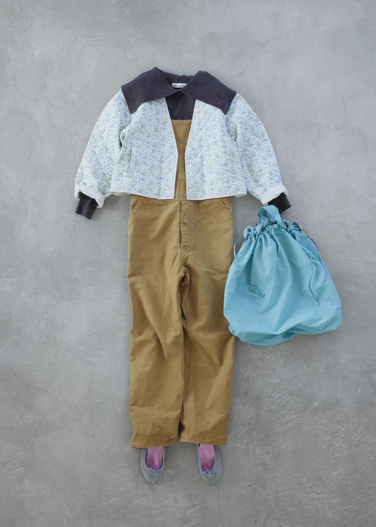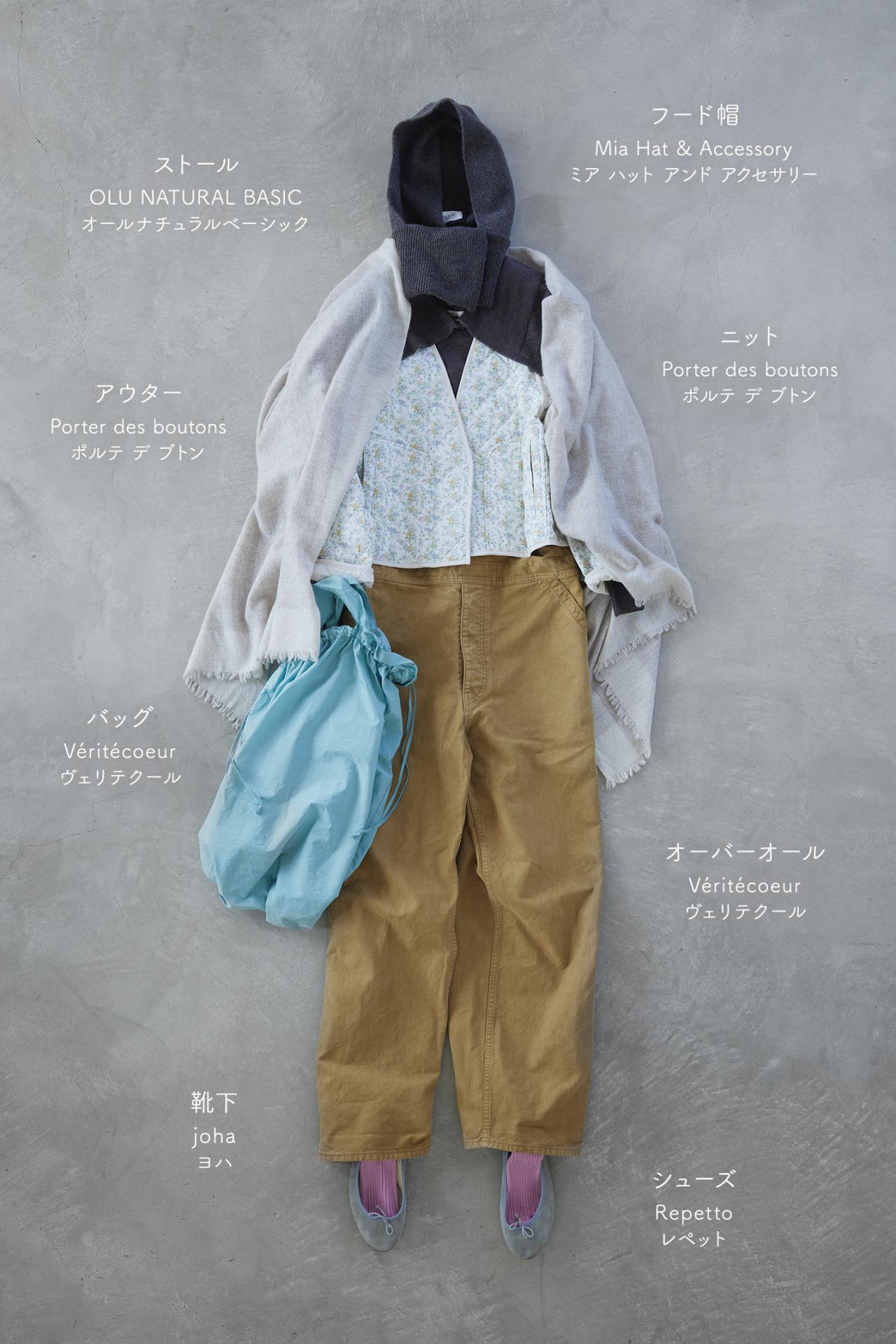 自宅から宿まで直行なので、とにかく楽で身軽、防寒対策も大らかに。アウターは軽めにして、大判のカシミヤストール、頭をすっぽり包むウールのフード帽、メリノウールの靴下など小物で暖かく、荷物は大きな巾着バッグに適当にまとめればOKです。休日の気分に合わせて優しい花柄を取り入れ、全体を柔らかい色合いでまとめました。