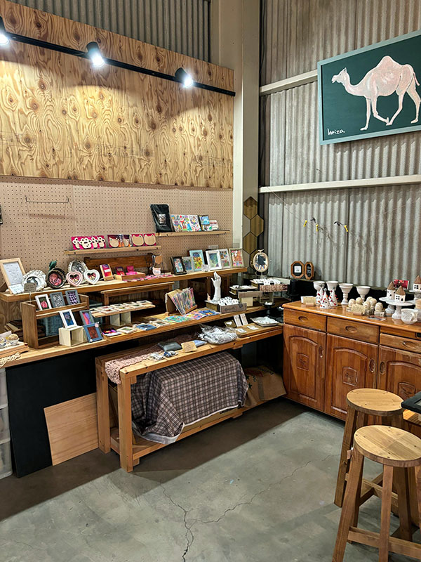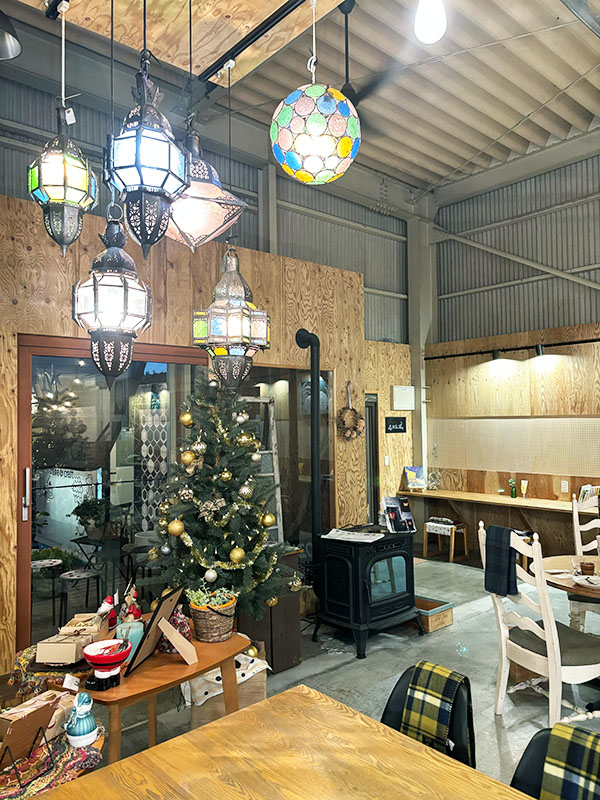 その名のとおり大きくそびえ立つ富士山と周囲には茶畑があり、倉庫を改装したカフェは天井が高く、広くてゆったりとした空間です。店内に入ると可愛らしいモロッコランプに迎えられ、まるで美術館のよう。お店全体がギャラリーとなっていて、時期それぞれに色々なジャンルの作品に出会えるのも楽しみの一つです。また、クラフトコーナーも併設されており、世界に一つだけの作品を購入できます。