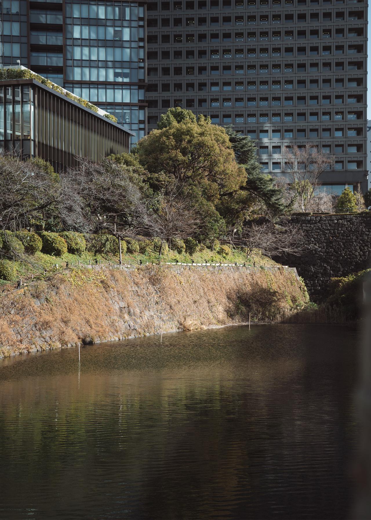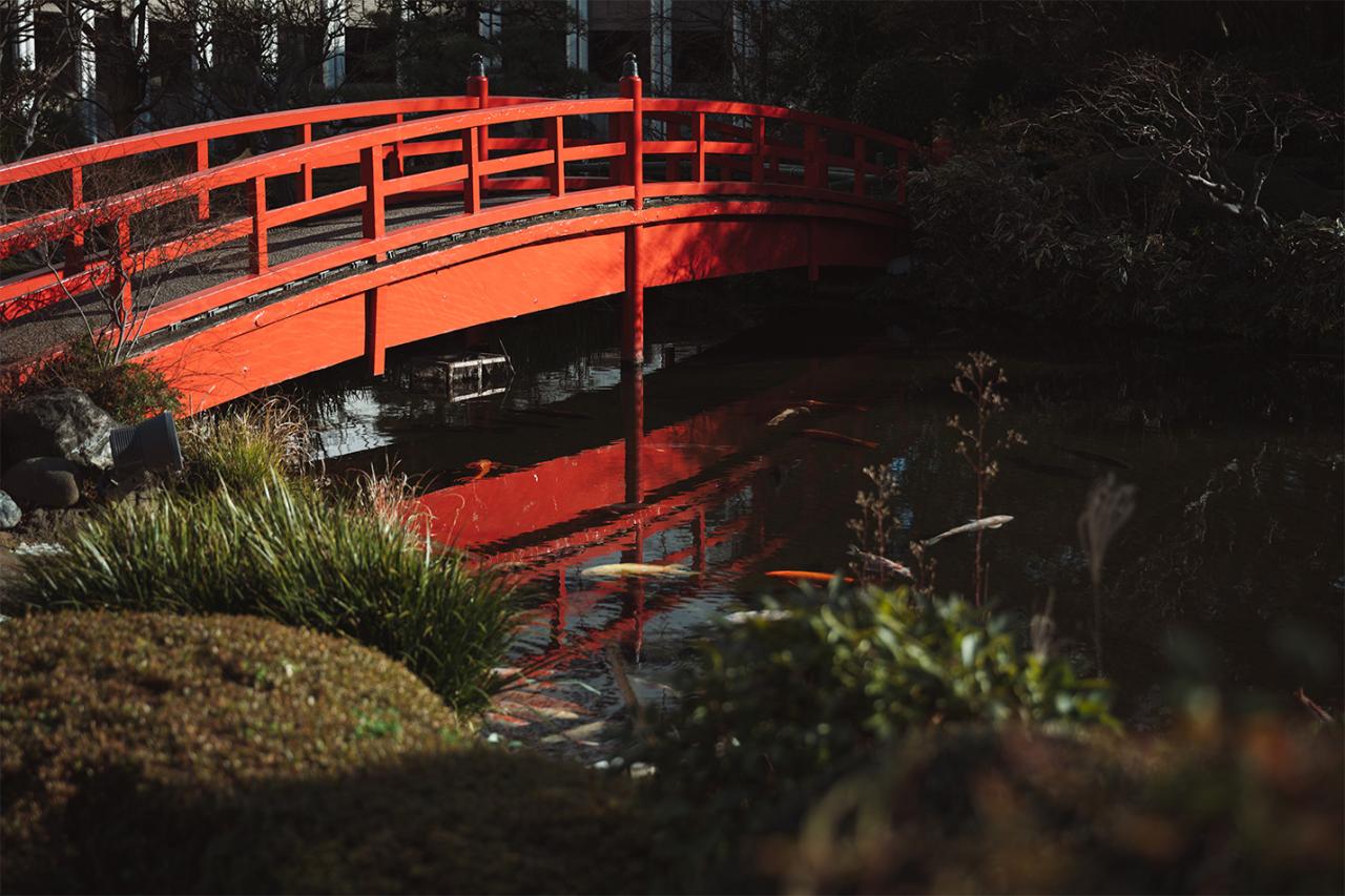 ホテル敷地内に広がる日本庭園は、訪れるたびにその美しさに感動させられます。かつての江戸城外堀に囲まれた約1万坪の敷地、400年余りの歴史がありずっと大切に手入れされてきたこの庭園には、滝のせせらぎ、池を泳ぐ鯉など、どこを歩いても風情を感じます。この日は夕方に散策したため、柔らかな光が庭園を包み込み、一層幻想的な雰囲気を醸し出していました。