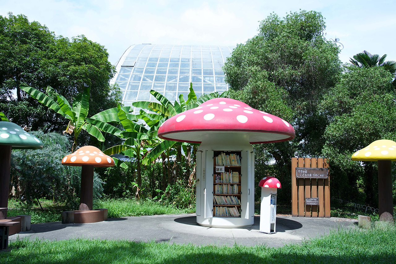 こちらは「平安の郷(さと)こども文庫 きのこの家」(通称:きのこ文庫)。「未来くん広場」という子供たちも遊べる遊具などがあるエリアの中にあり、きのこの扉をぱかっと開けると書庫に!なんとも可愛らしいです。置いてある本は植物図鑑や児童書など。最近ではビル・ゲイツ氏からの贈り物が見つかったことも