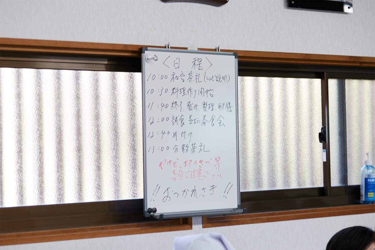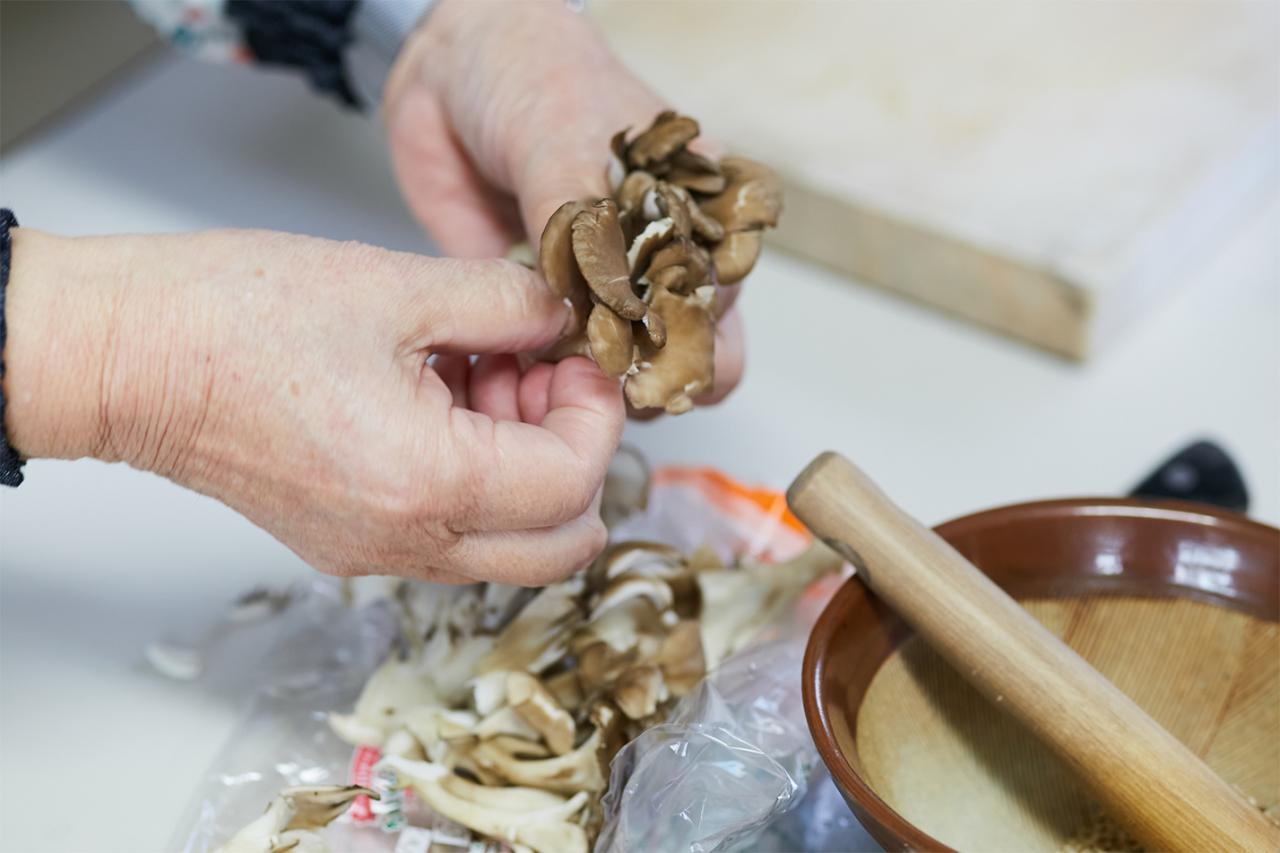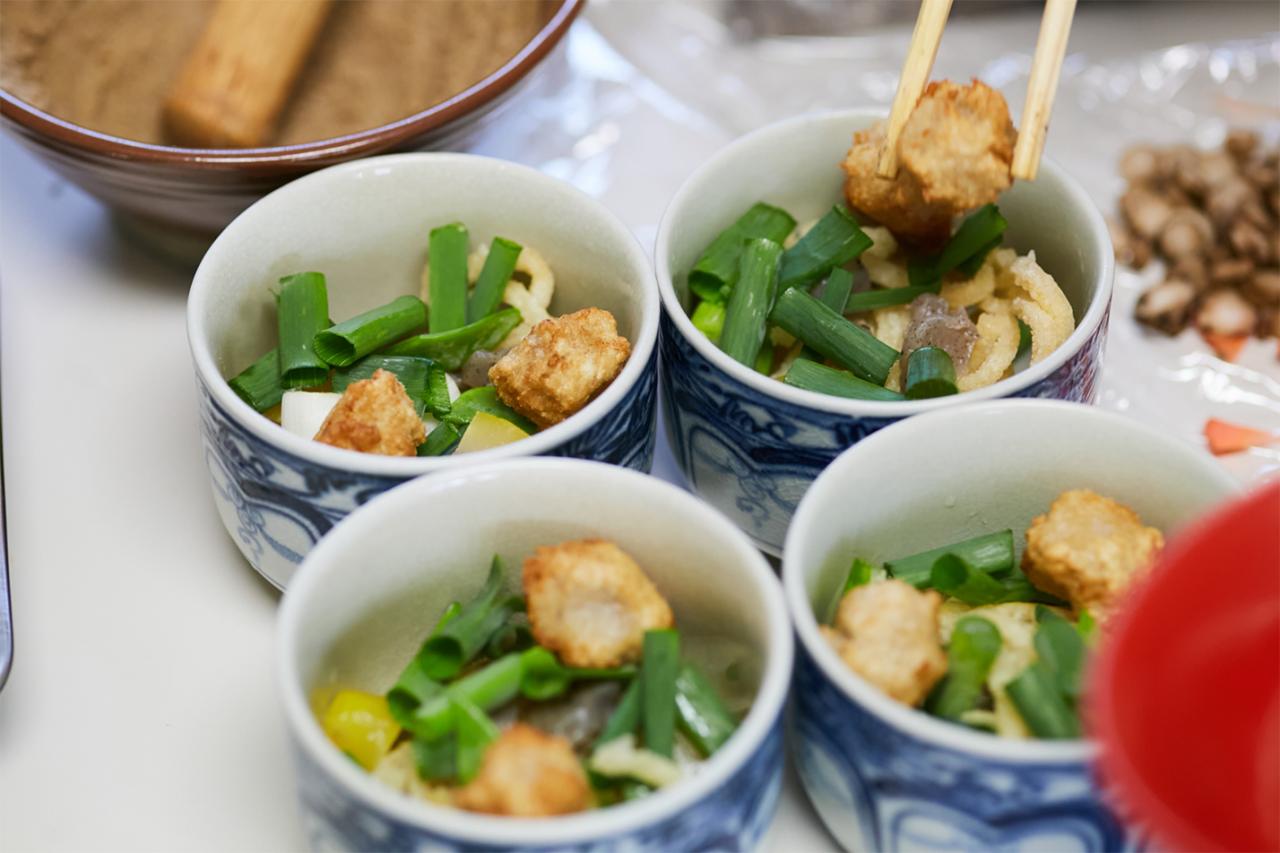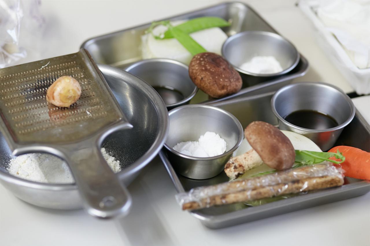 家庭でも取り入れやすい精進料理を学ぶことができると人気で、リピーターや遠方からの参加者も多いこちらの料理教室。調理は〈東林院〉の厨房である「添菜寮(てんさいりょう)」で行う。今日の献立は「揚げうどんのカブラ蒸し」、「カレー豆腐のあんかけ」、「春菊とマイタケのゴマ酢和え」の3品。旬の食材を使った料理や、冬ならではの体が温まる料理が選定された。まずはお茶をいただきながら、西川住職より3品の作り方や精進料理の心得などを聞く。