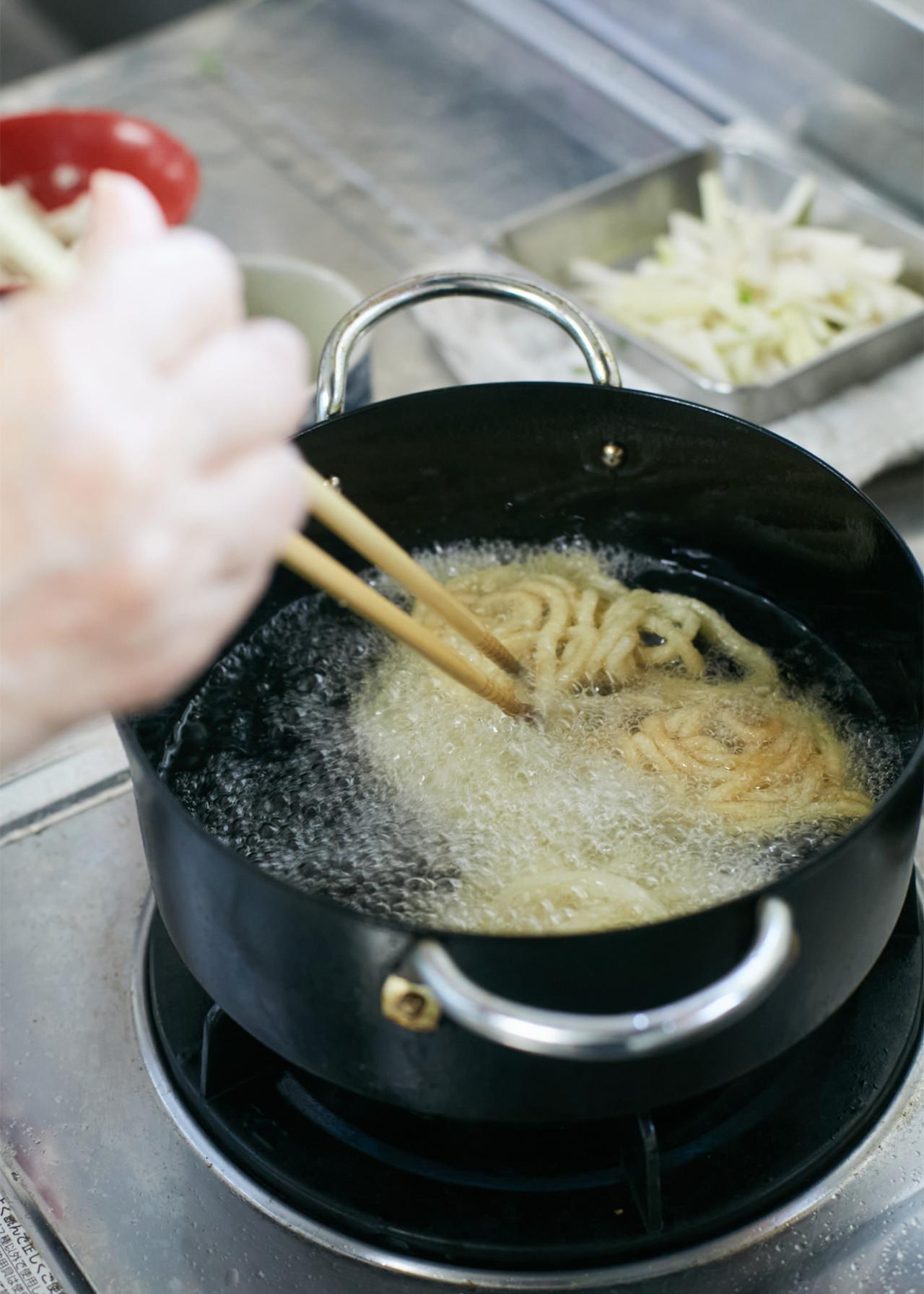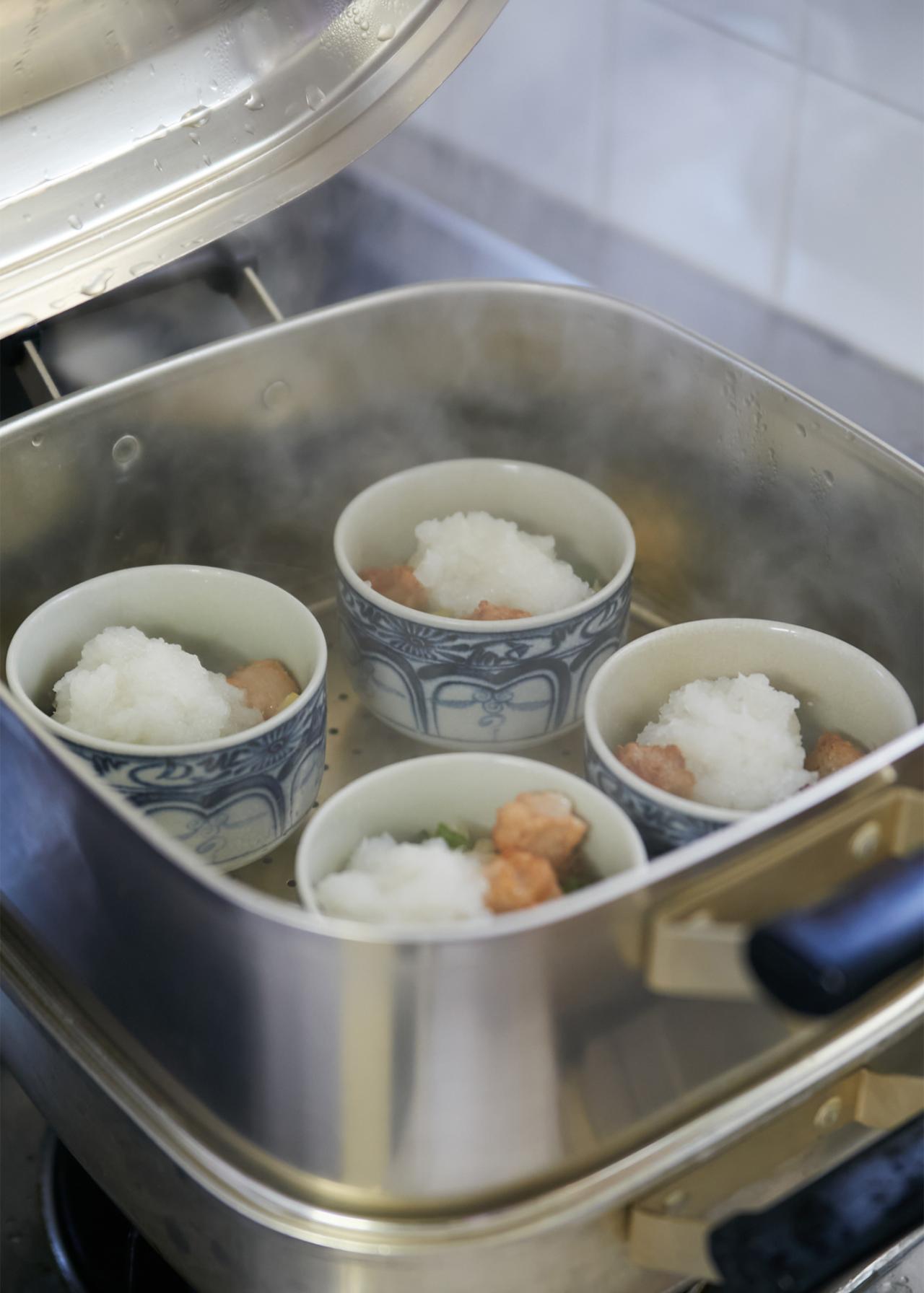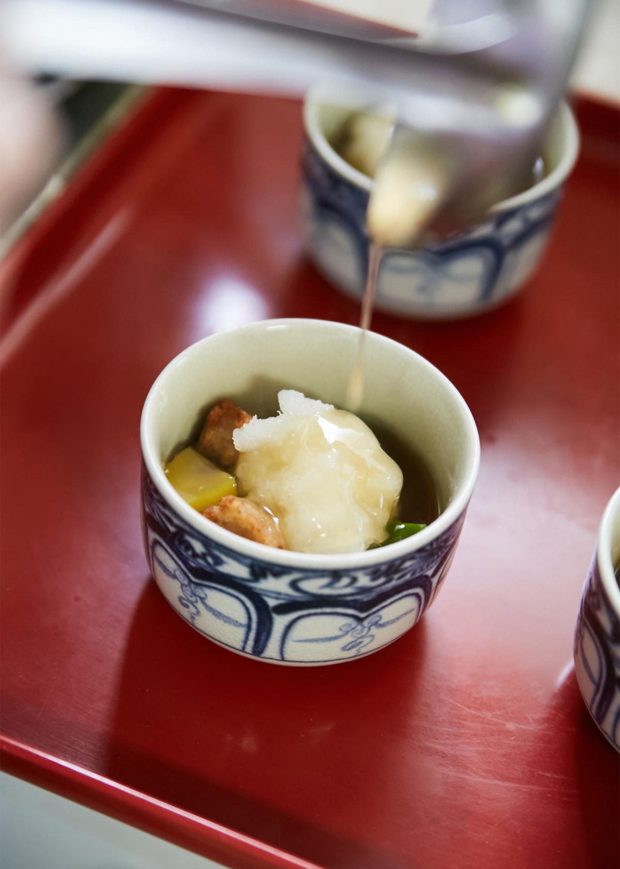 家庭でも取り入れやすい精進料理を学ぶことができると人気で、リピーターや遠方からの参加者も多いこちらの料理教室。調理は〈東林院〉の厨房である「添菜寮(てんさいりょう)」で行う。今日の献立は「揚げうどんのカブラ蒸し」、「カレー豆腐のあんかけ」、「春菊とマイタケのゴマ酢和え」の3品。旬の食材を使った料理や、冬ならではの体が温まる料理が選定された。まずはお茶をいただきながら、西川住職より3品の作り方や精進料理の心得などを聞く。