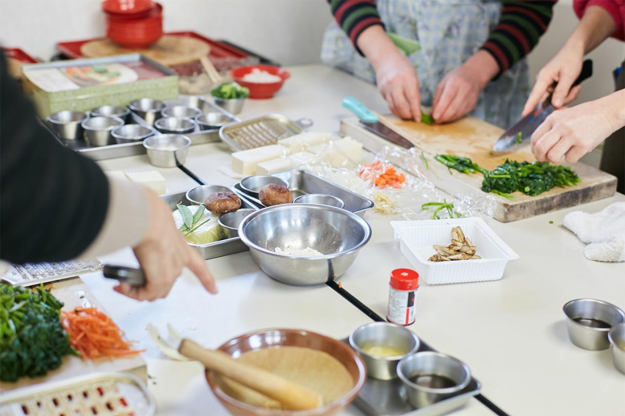 調理は3〜4人がひとつの班となり、協力して行う。先ほどの西川住職の教えをもとに各自で考えながら作業を進めるのが、この料理教室の特徴。野菜の皮や根を捨てずに使う、煮汁を活用するなど、食材を無駄にしないための方法を考え実行していく。洗い物をなるべく増やさないなど、水を無駄遣いしない意識も大事だ。