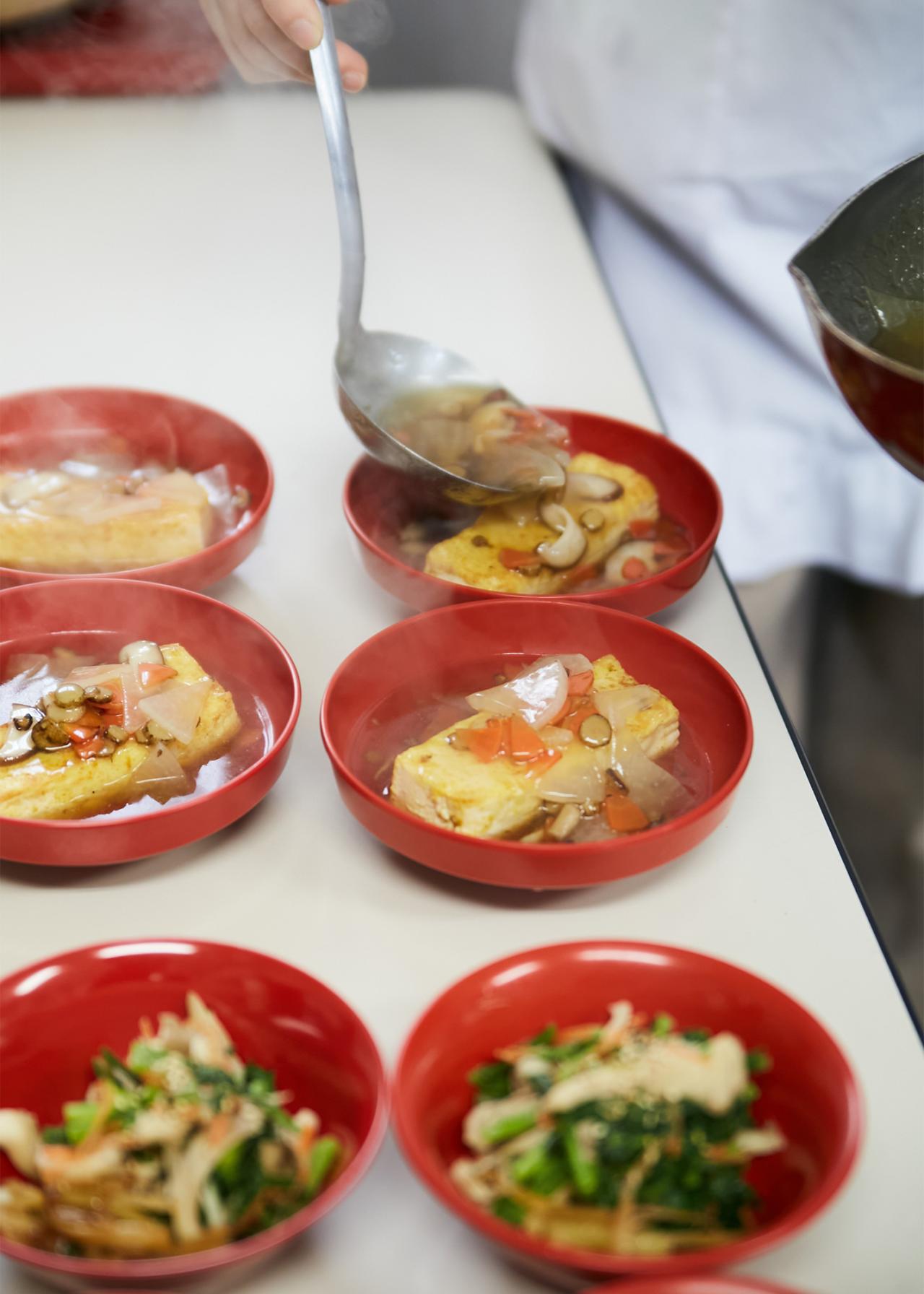 3品の料理が完成したら、各自で盛り付け・配膳まで行う。参加者が作った3品以外に、西川住職が作った品が加わって、立派なお膳に。