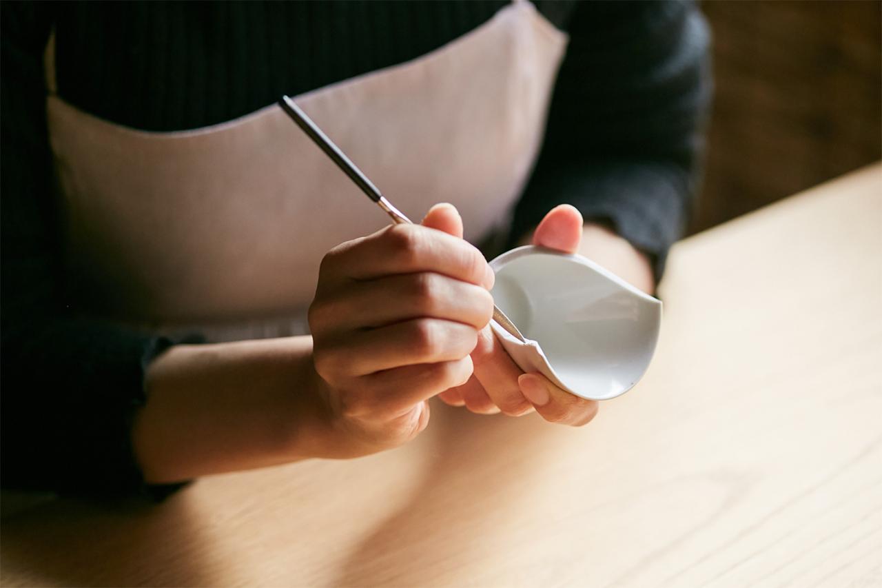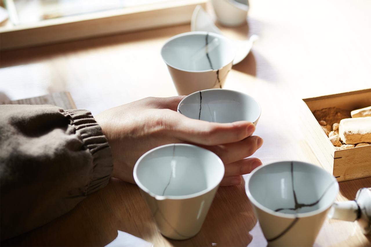 〈POJ Studio〉では特に金継ぎの体験に力を入れている。金継ぎとは、漆を使って欠けやひび、割れが生じてしまった器を修復する技術。仕上げに金粉などを使って装飾を行えば、修復した箇所を活かしながら器に新しい価値を与えることができる。