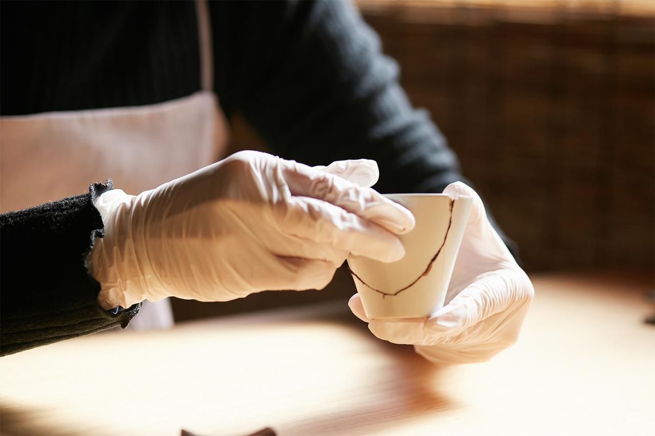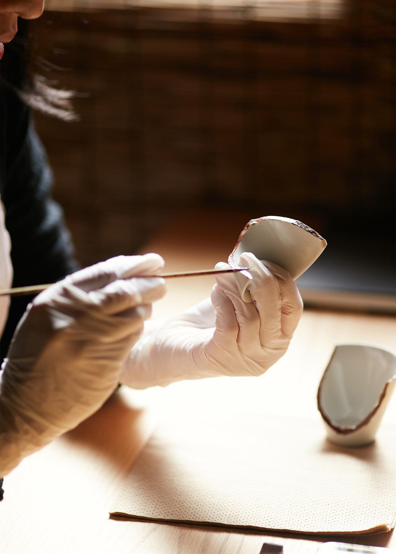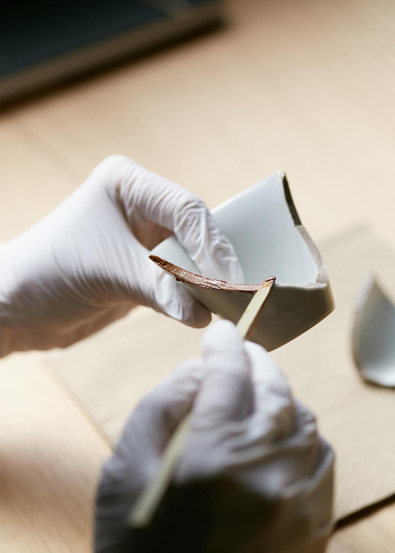 続いて生漆(きうるし)をテレピン油で希釈したものを、欠片の断面、ヒビ、かけている部分に塗っていく。漆は肌につくとかぶれてしまう恐れがあるため、ここからの作業は手袋が必須。内側から外側の順番で作業すると、余計なとこに漆がつきにくくキレイに塗れる。