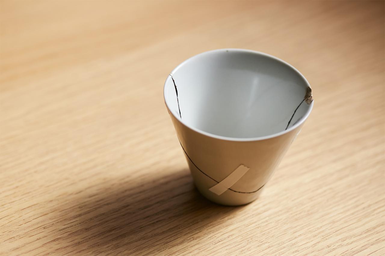 ぴったりくっついたら作業は完了。外れないようにマスキングテープで固定して、1週間を目安に〈POJ Studio〉の室で保管後、できあがった器は自宅へ郵送される。そのままの状態で記念にオブジェとして飾る人もいれば、金継ぎキットを購入して続きの作業を自宅で行う人もいるそう。