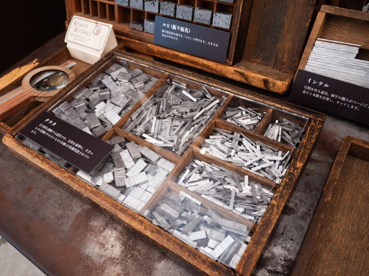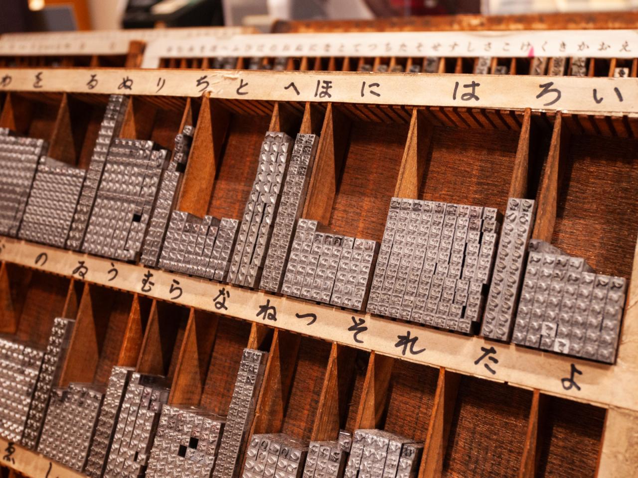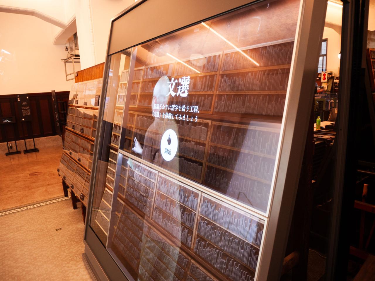中に入ると、まさに「印刷所」そのもの。かつての印刷工場を一部再現しているということで、活字棚がズラーっと並んでいる風景は、当時を知っているわけでもないのに何だか懐かしい気持ちに。立派な印刷機も鎮座していて、制作現場の様子がうかがえます。