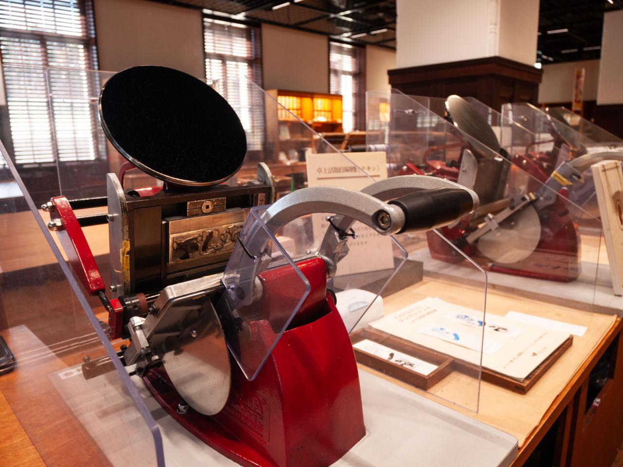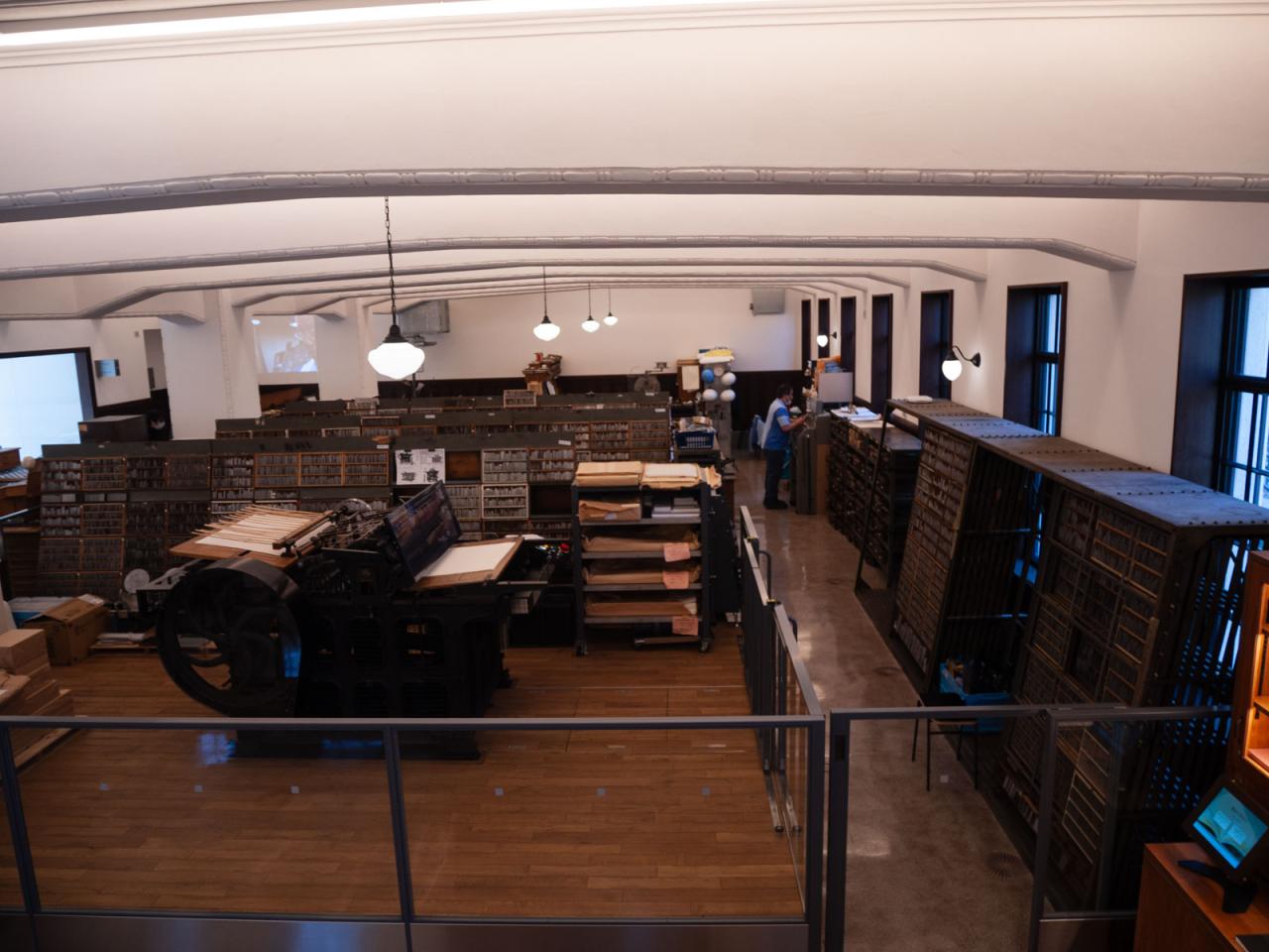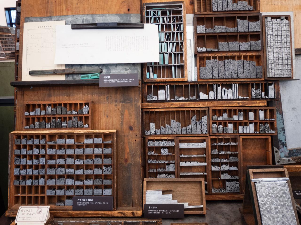 中に入ると、まさに「印刷所」そのもの。かつての印刷工場を一部再現しているということで、活字棚がズラーっと並んでいる風景は、当時を知っているわけでもないのに何だか懐かしい気持ちに。立派な印刷機も鎮座していて、制作現場の様子がうかがえます。