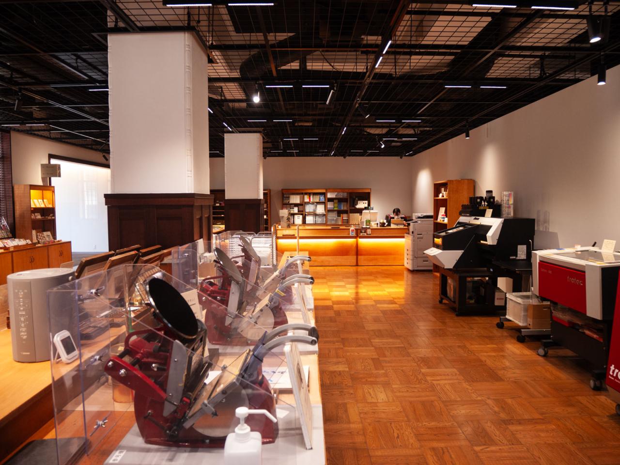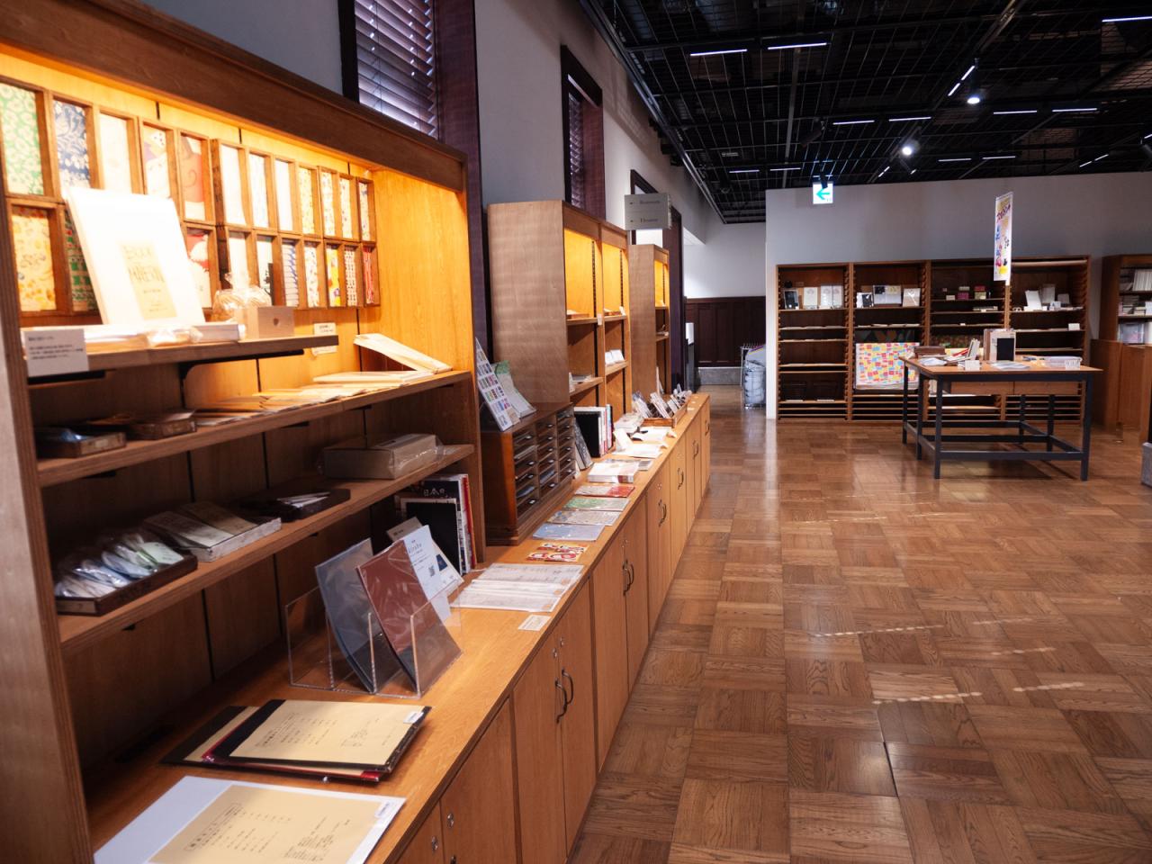 2階は企画展を行う展示スペースと、ワークショップなどを行う制作室。活版で印刷された雑貨や印刷にまつわる本が並ぶ購買スペースもあります。