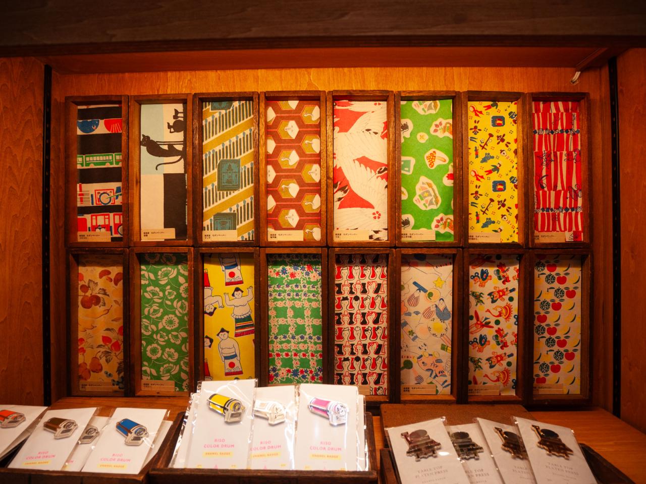 インクをローラーで練りながら版に移し、短冊状の紙がのった板を版にぐっと押し付けて印刷ができます!実際に体験すると、いろいろ作ってみたくなってきます。あんな名刺やこんなカードや…と妄想は膨らむのですが、この施設はあくまで博物館的な役割で、実際に印刷を発注することはできません。代わりに…というわけではないとは思いますが、素敵なグッズがいろいろ販売されていました!