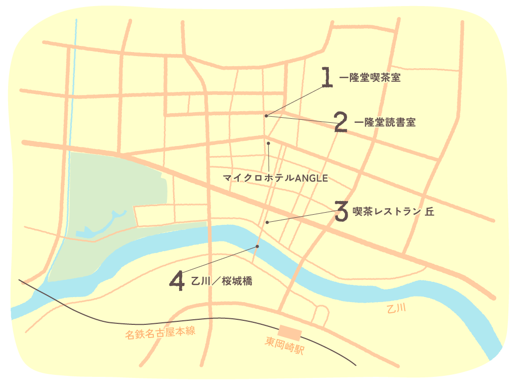いつもと違う愛知県観光には、東岡崎の〈一隆堂喫茶室〉〈喫茶レストラン 丘〉〈乙川〉〈桜城橋〉がおすすめ。