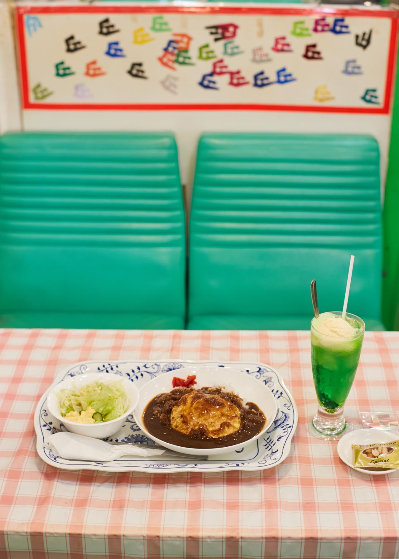 徐々に店内の壁やイスに貼るお客さんが増え始め、まるでアートのような唯一無二の内装に。意図的ではなく、偶然によって生み出されたというのもまたおもしろい。ランチに頼んだのは、看板メニューのエッグカレーセット。フォンドボーのうまみが際立つカレーに目玉焼きがのった古き良き喫茶店らしいカレーで、なんとも味わい深い。クリームソーダがついてくるので、レトロ喫茶メニューを楽しみたい方にもおすすめ。