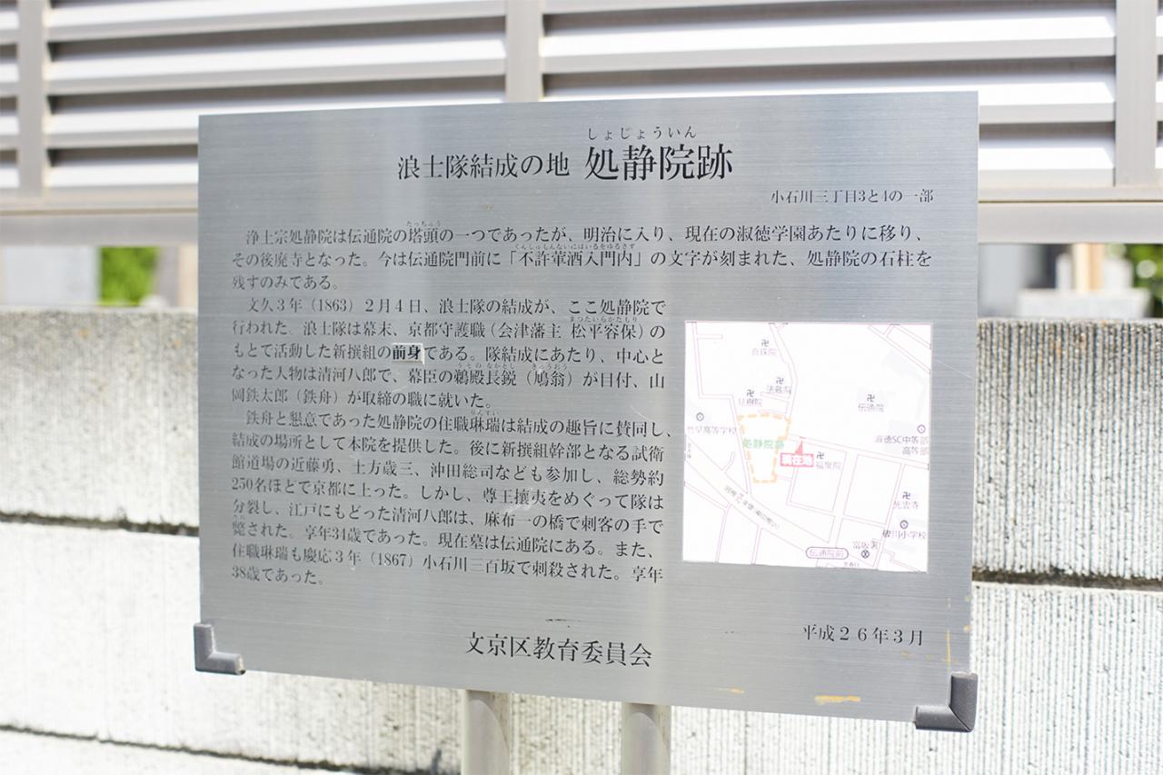 1863年(文久3年)2月4日に、〈傳通院〉の塔頭寺院である「処静院(しょじょういん)」で、浪士隊の結成会が執り行われた。この結成会には後の新選組の総長・近藤勇をはじめ、土方歳三、沖田総司など総勢250人が集まったという。