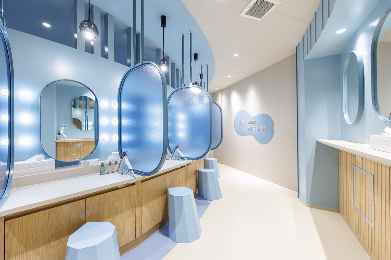 リニューアルしたパウダールームも綺麗で充実していた。女性のパウダールームは、「水の都・三島」をイメージした水色が使われており、清潔感のある心地良い空間。1日の疲れがしっかり癒やされた。