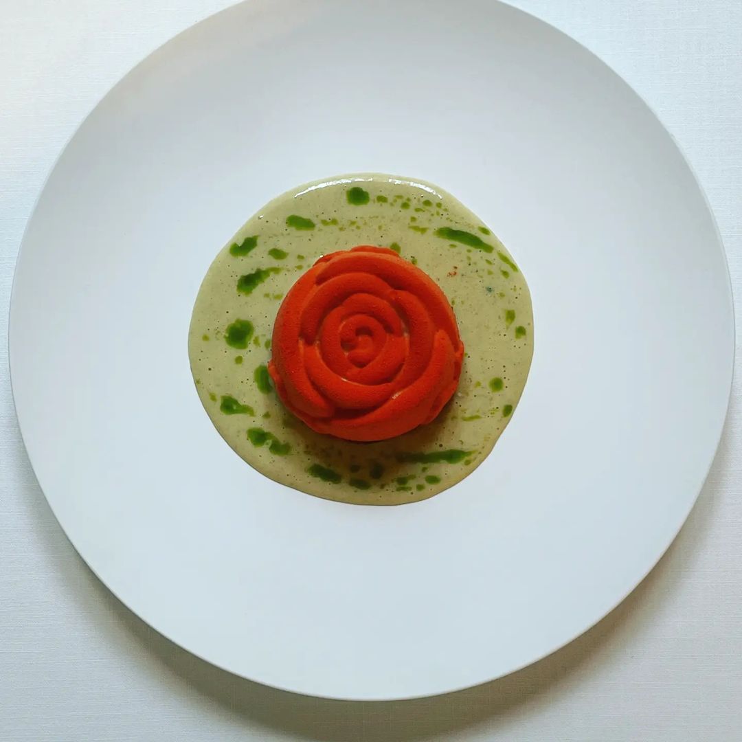 そしてぜひオーダーしたいのが、上井さんが一番力を入れているという企画展の期間だけ登場するコンセプトデザート。「昔はレストランって文化の発信者だったと思うんです。SNSなどがない時代に、人々をアッと言わせるものを作ってきた。今はインフルエンサーがお客さんになってしまったけど、今一度、私たちが発信者になりたいと思っています」と上井さん。その思いの結晶として、自由にアイデアを絞れるコンセプトデザートがあるのだという。「展示の内容がわかるのはギリギリなのですが、少ない情報を膨らませて考えるのがすごく楽しいんです。展示のテーマになった“サンセット”、“サンライズ”の時間はロマンチックですよね。さらに、展示の中に唇が印象的な作品があったので、それをモチーフにしました」。