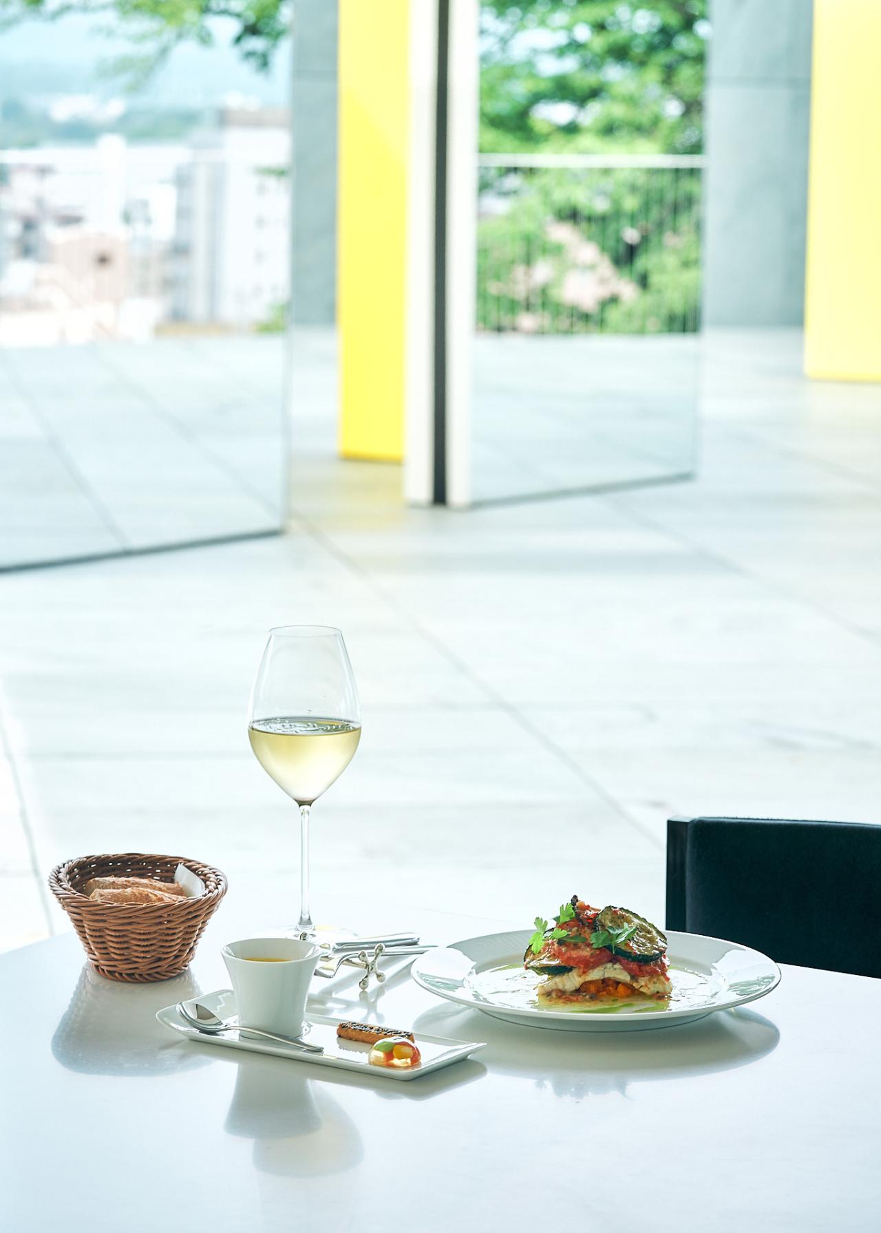 この日はスズキを蒸し、ズッキーニやトマトなどの夏野菜を重ね、スパイスを効かせたビネグレットソースをかけている。ハーブが散らされ、香りがいい。(メニューは企画展ごとに変更あり)