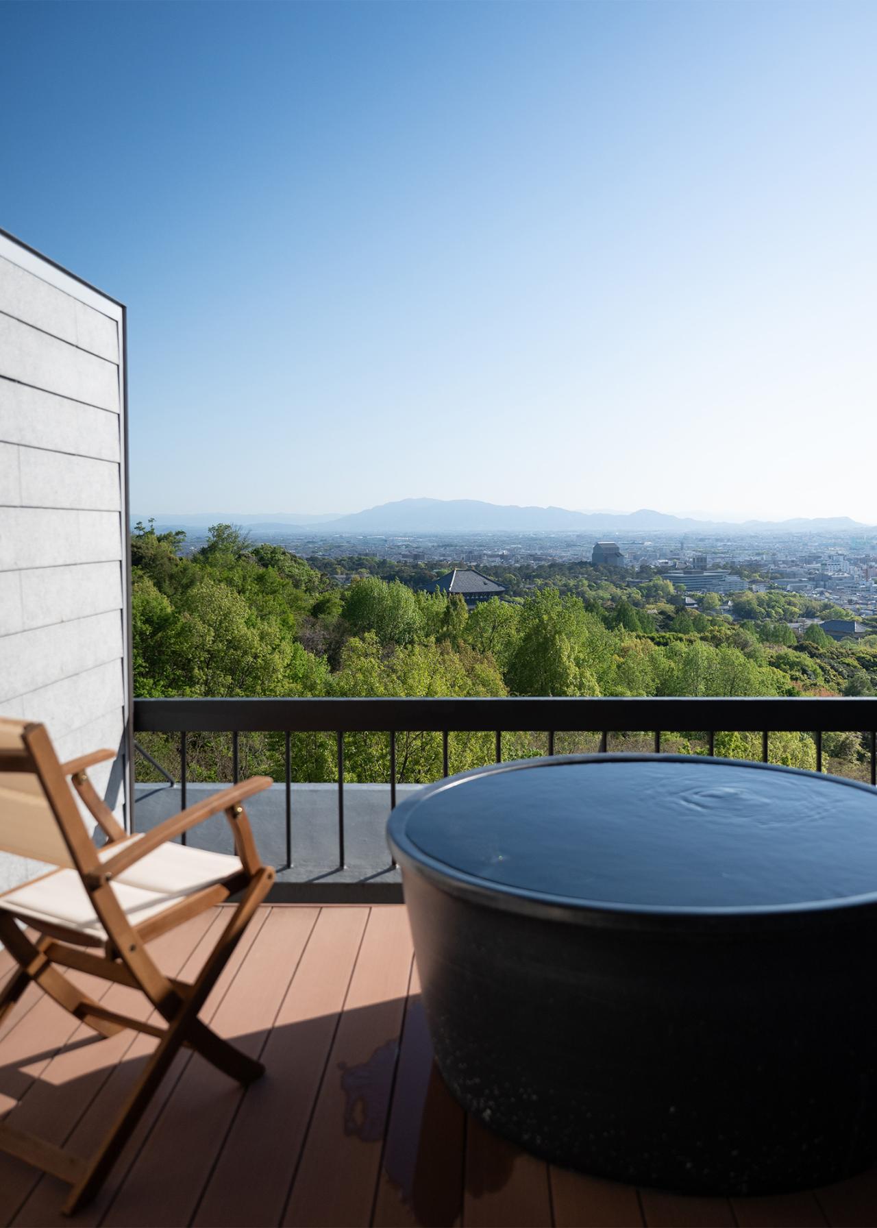 ホテルには展望露天風呂があり、予約して利用することができます。開放感にあふれ、湯船に浸かりながら見上げる空はどこまでも澄んでいて、その奥に広がる若草山の景色が思いのほか近く、まるで自然の中に溶け込むような感覚になりました。