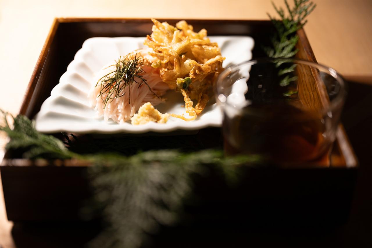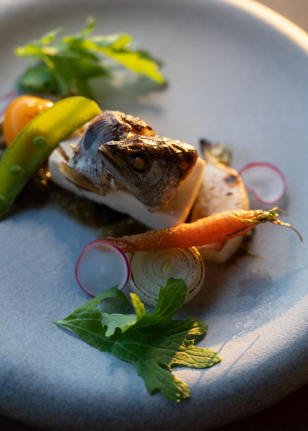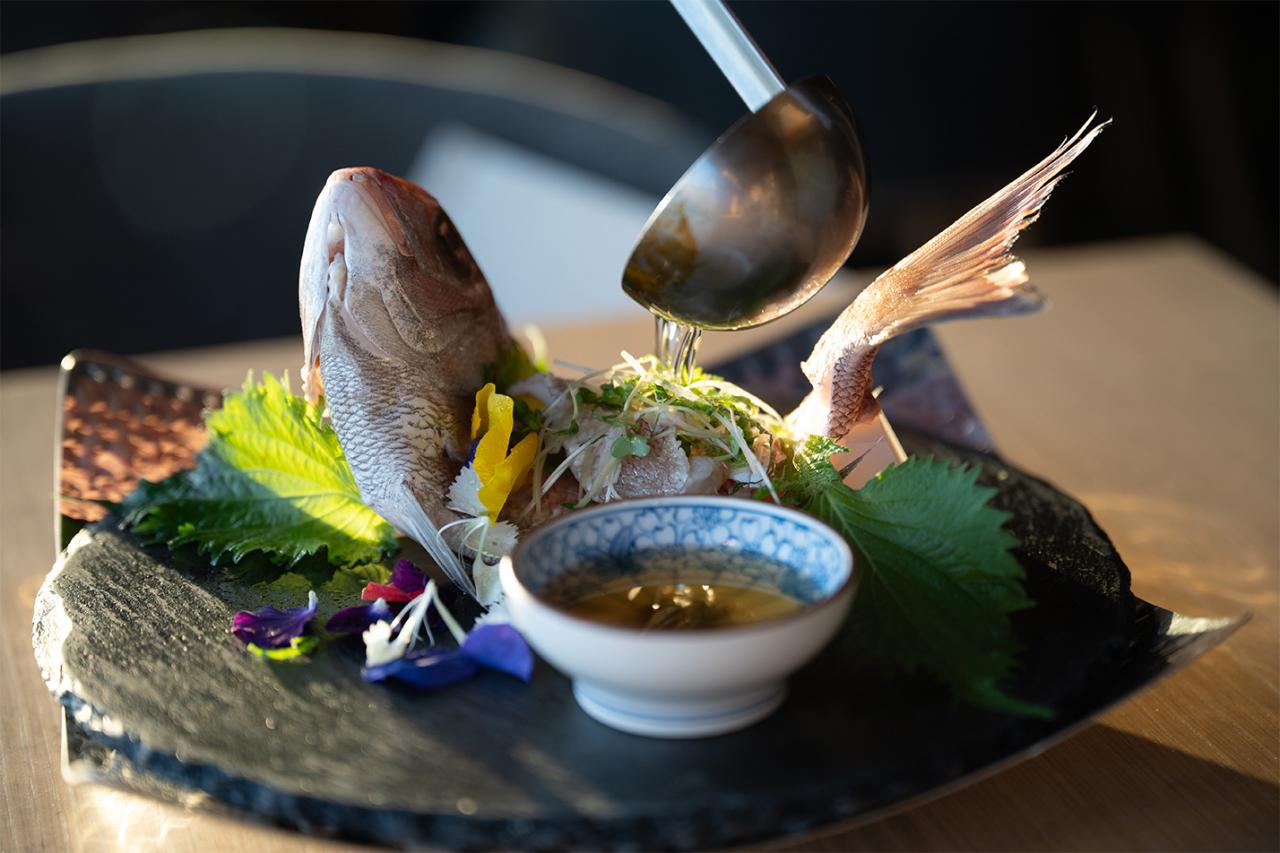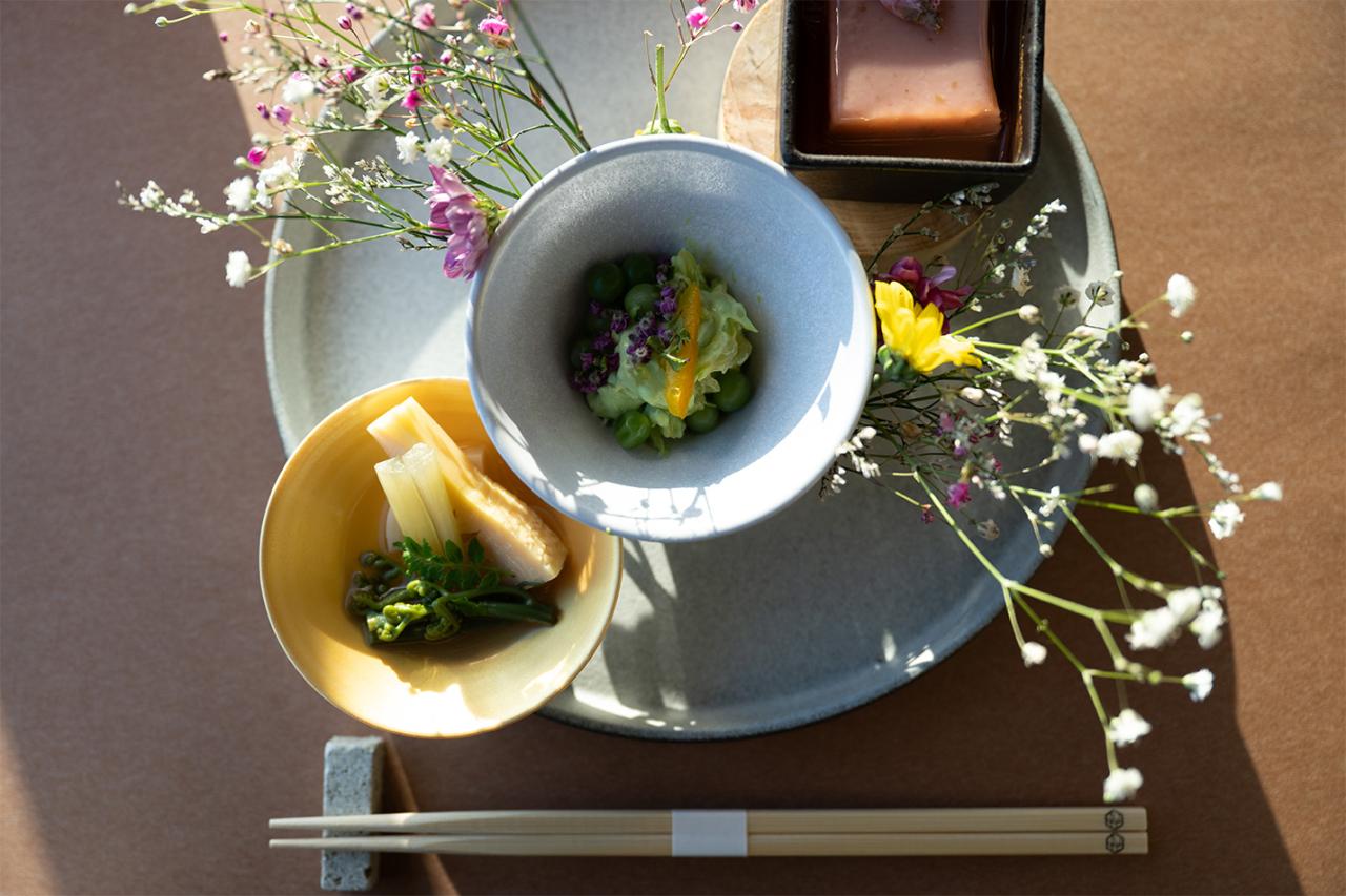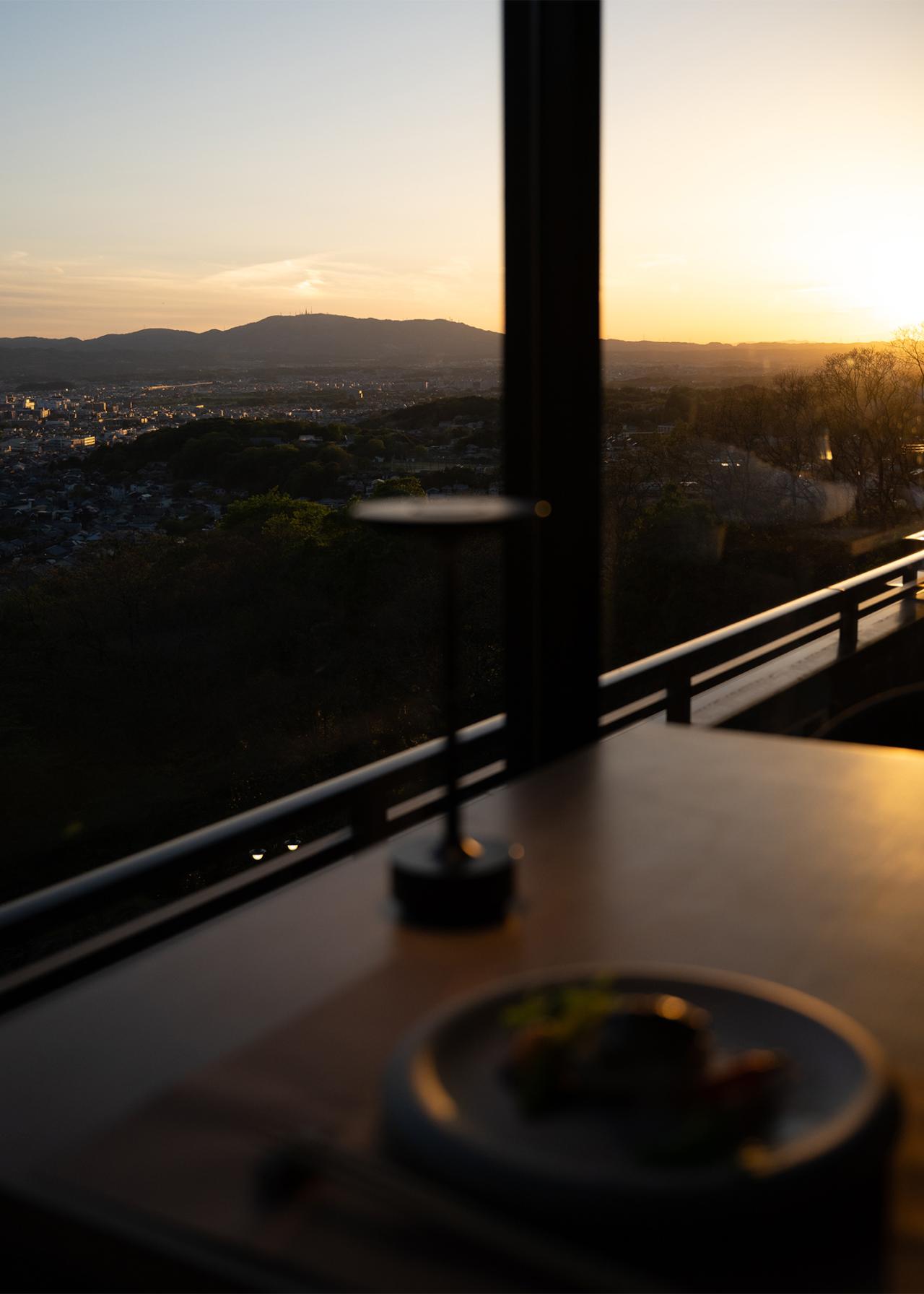 夕食はサンセットとともに始まりました。レストランの窓から見える夕景がどんどん色を変えていくのを眺めながらの食事は、それだけで特別。お料理は奈良の食材を中心にどれも丁寧に作られていて、一皿ごと見た目も味も楽しみながらいただきました。