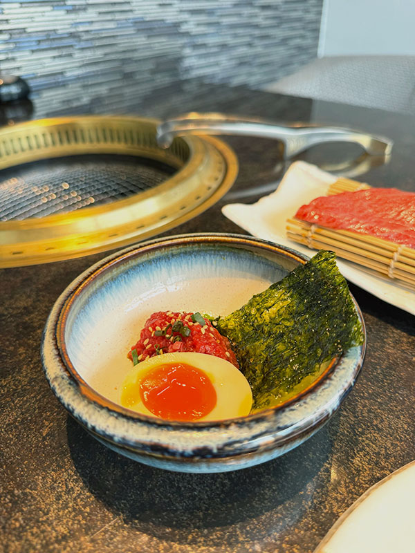 ランチタイムは、リーズナブルに楽しめる「和牛カルビ重」や本格的なコース料理まで予算にあわせてメニューが選べます。今回は和牛ユッケ付の網焼きランチ「竹」をチョイス。