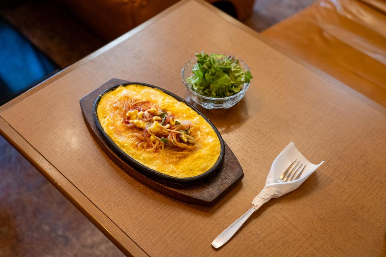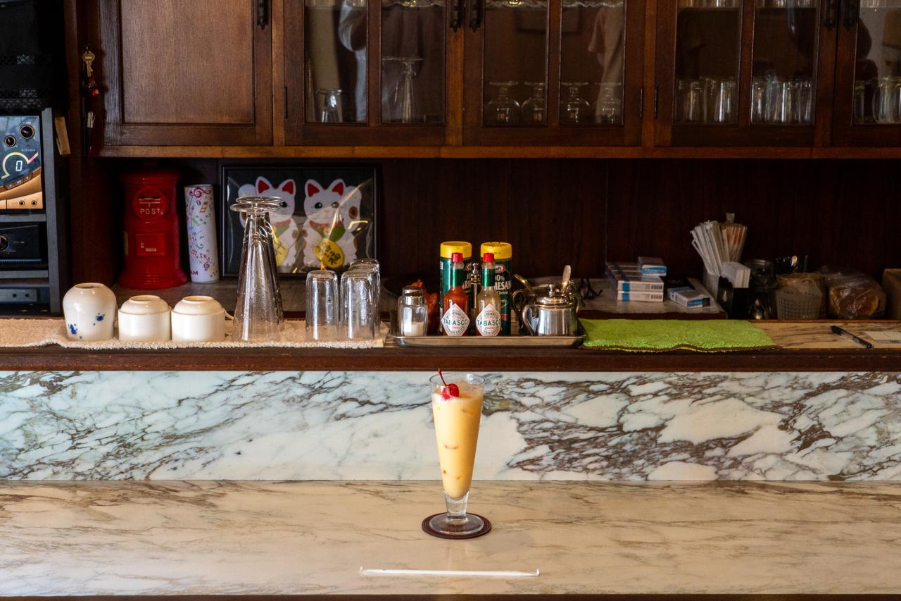 この雰囲気に合うのは…とメニューを見るとミルクセーキが!最近なかなか見ないですよね。注文するとママさんがカウンターの中でシェイカーを振ってくれました。現れたのは、優しい黄色にさくらんぼの鮮やかなピンクの組み合わせ。お店と完全にマッチする色合いです。飲んでみると味も優しくて、なんだか懐かしい甘さが体に沁み渡りました。