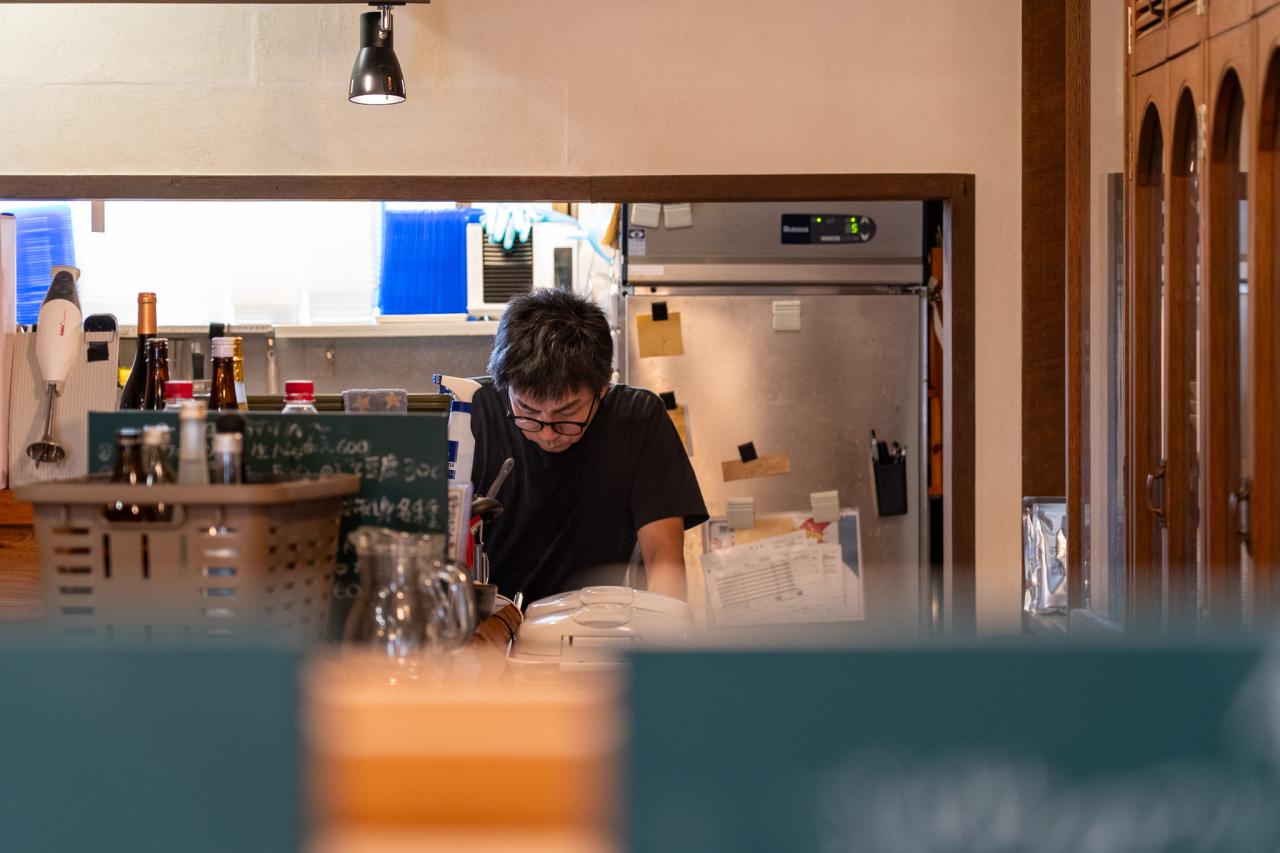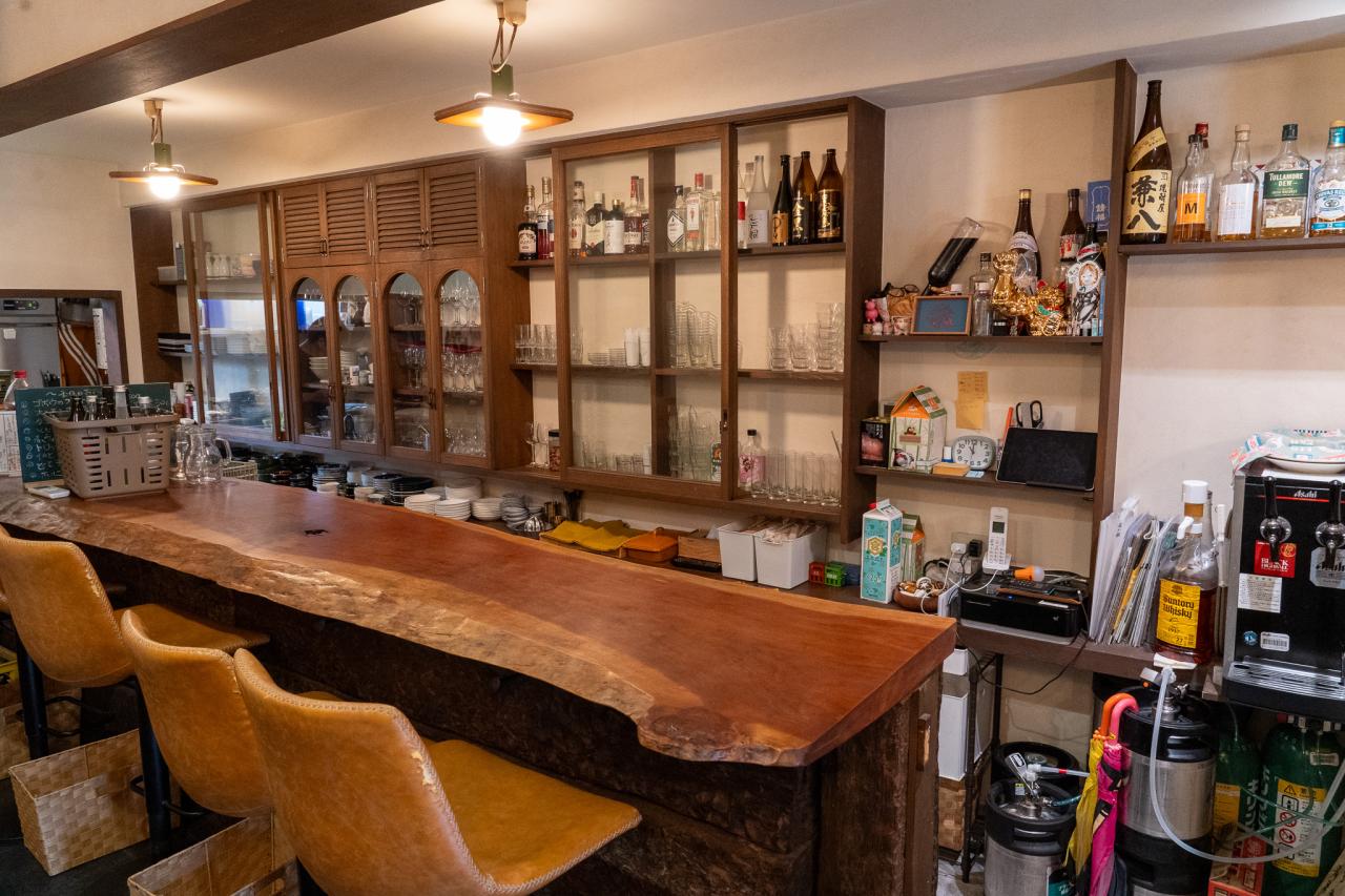 店内は、居酒屋というより素敵な洋食屋さんのような感じで、立派なカウンターも。こちらは元々喫茶店だったそうで、少しクラシックな雰囲気の設えが気に入って、そのまま使っているものも多いのだとか。「ただドアと窓にはこだわって、新しくしました」と三津山さん。「大きな窓ガラスにすることで、お店の様子が外から見えて『なんか楽しそうだな』と思ってもらえるのもいいし、中のお客さんが外を通る人に『楽しそうでしょ』って感じで(笑)通りを眺めるのもいいなぁと」