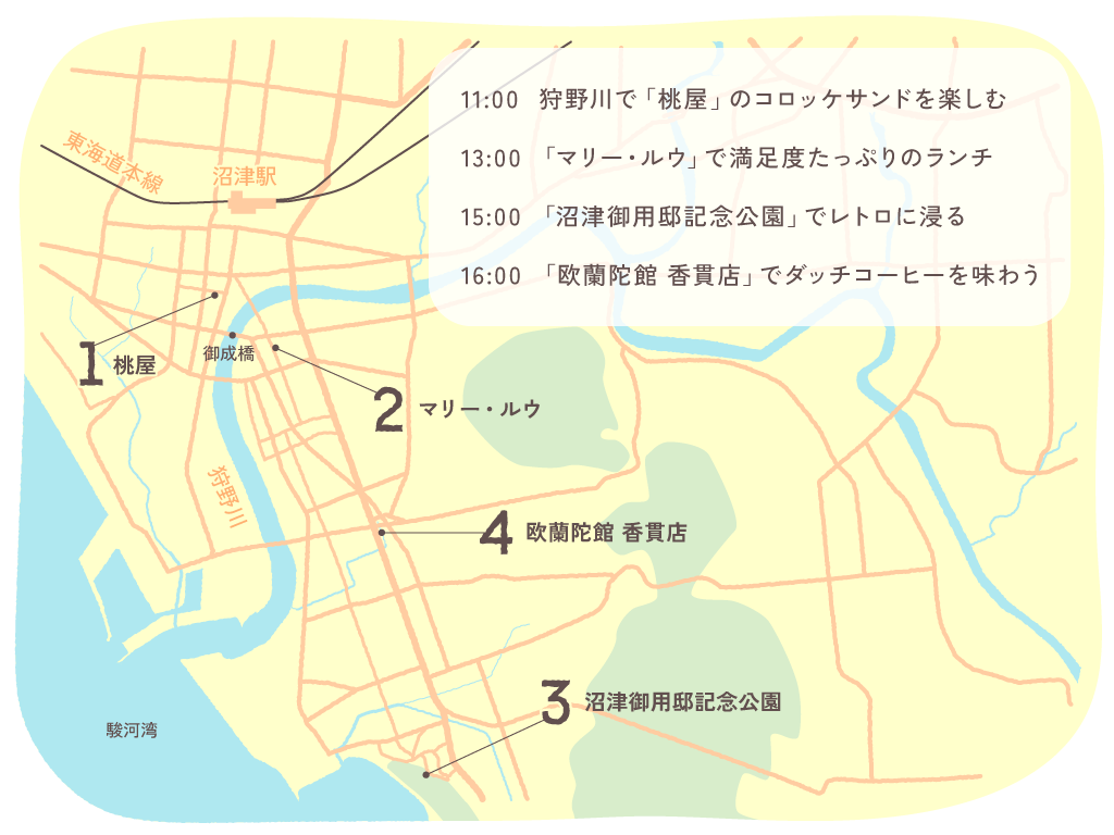 いつもと違う静岡県観光には、沼津市の〈桃屋〉〈マリー・ルウ〉〈沼津御用邸記念公園〉〈欧蘭陀館 香貫店〉がおすすめ。