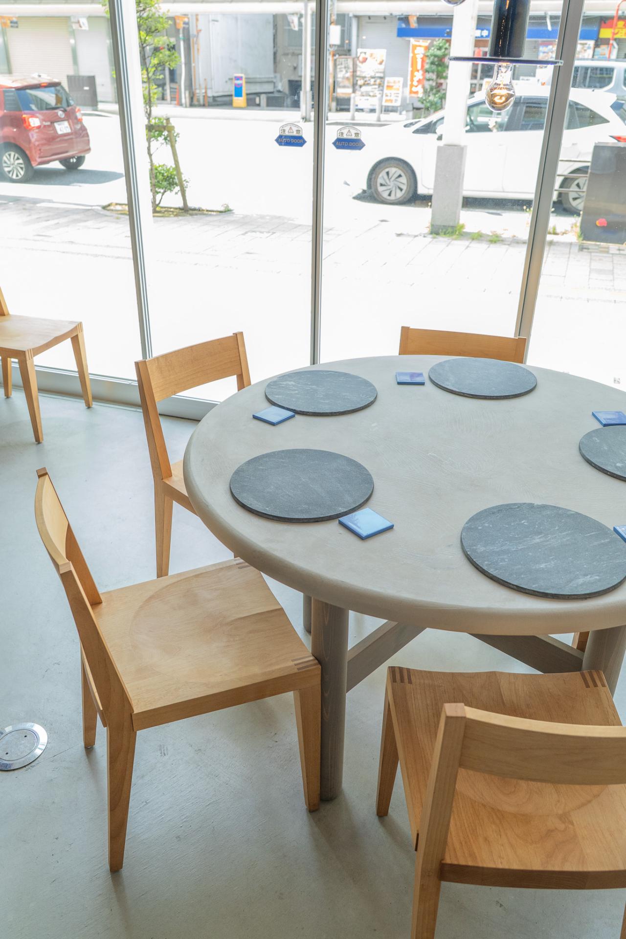 その1階に〈汽[ki:] 静岡〉がオープンしたのは2024年の12月。店内は細長い敷地にカウンターがすーっと並び、奥の大きな窓の前にはテーブル席が。その大きな光が差し込んで、とても開放感があります。床や壁、カウンターと全体的に無彩色で統一されている中で、タイルなど鮮やかな青が差し色となっているのが、なんとも素敵です。