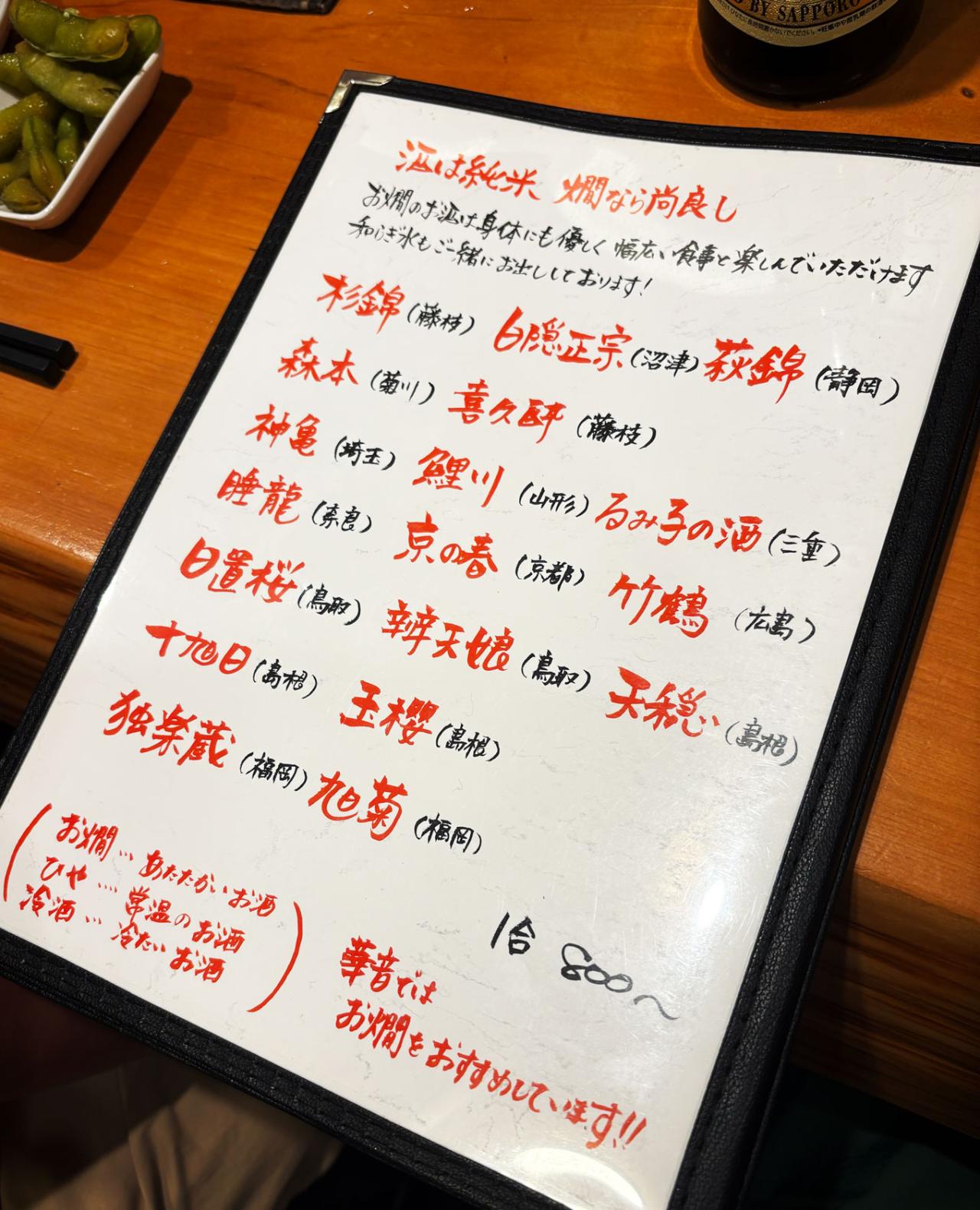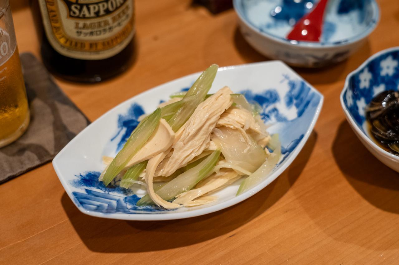 ビールで軽く口を湿らしながら、お燗とともに注文するアテを吟味。まずは「干し湯葉とセロリのあえ物」と「大和しじみ紹興酒漬け」に決めました。お燗は地元静岡・菊川のお酒「森本・炸裂純米辛口」をいただきます。