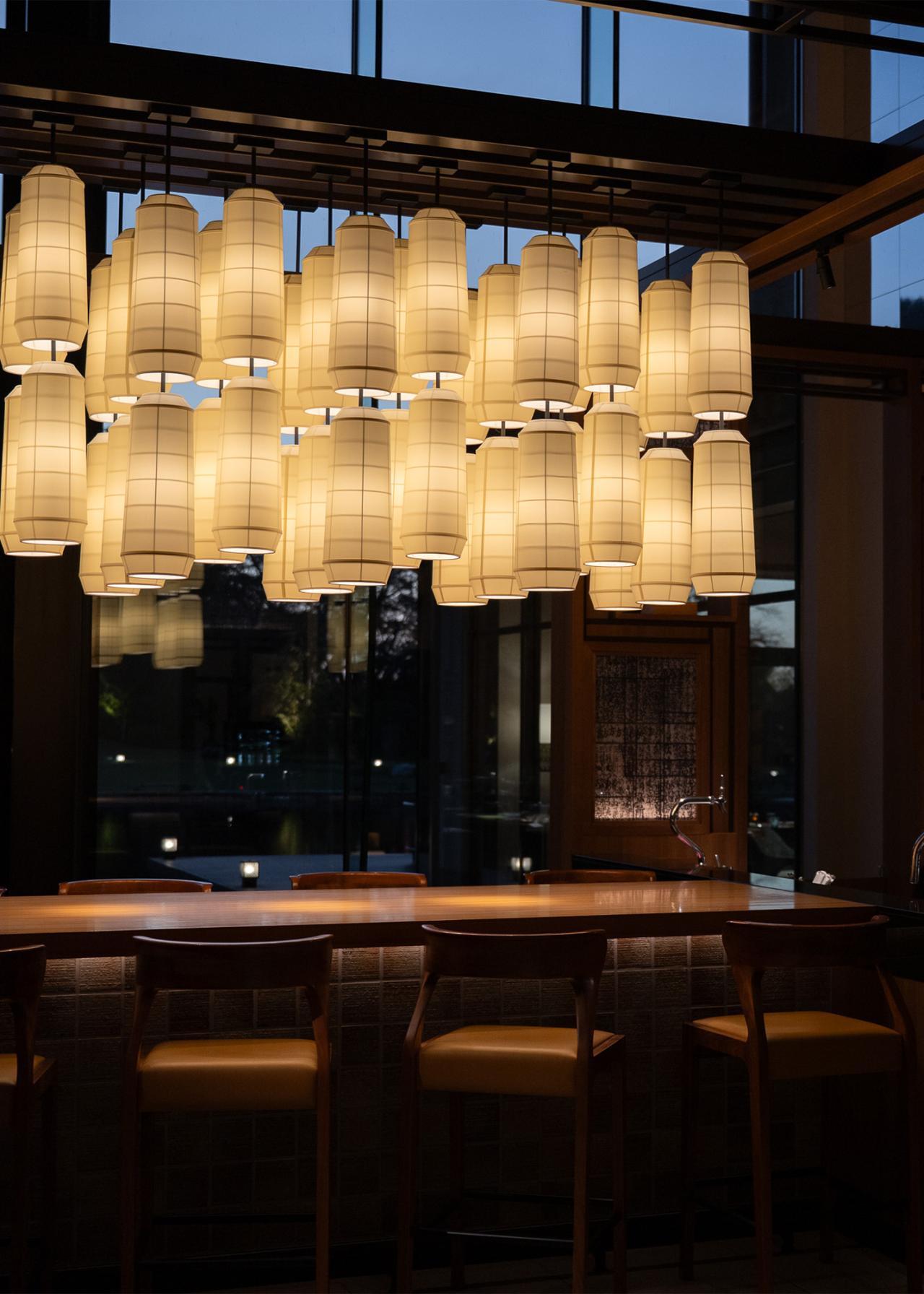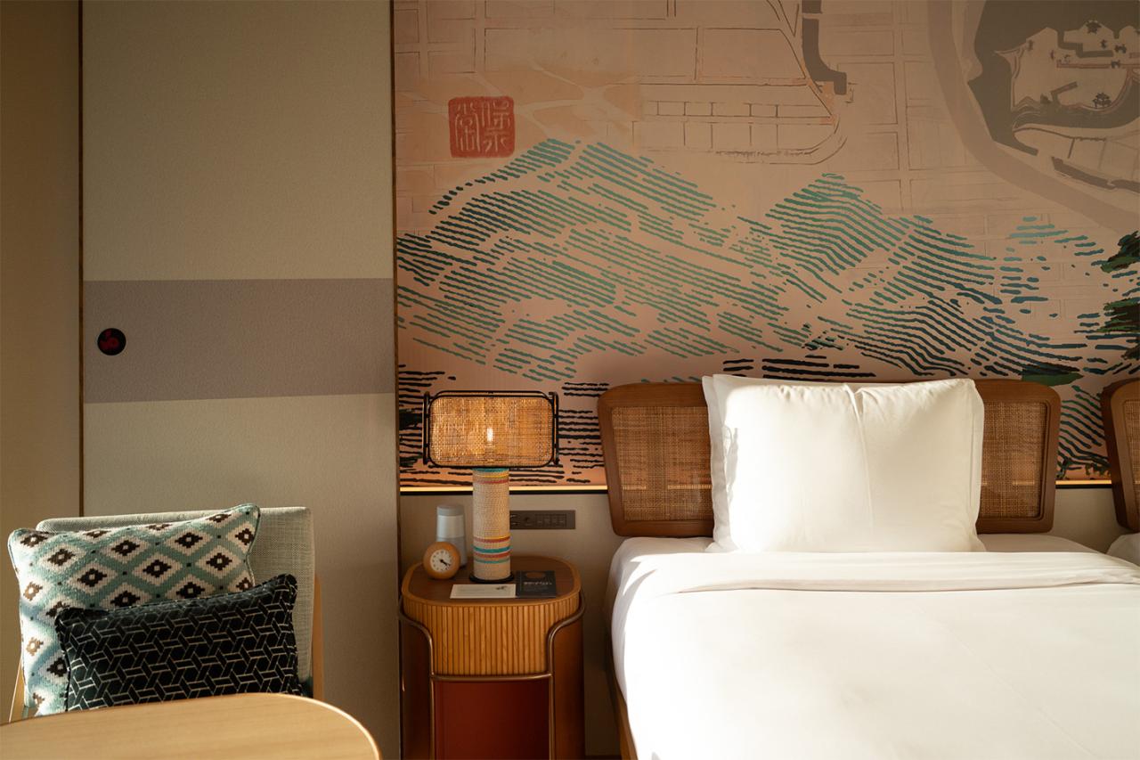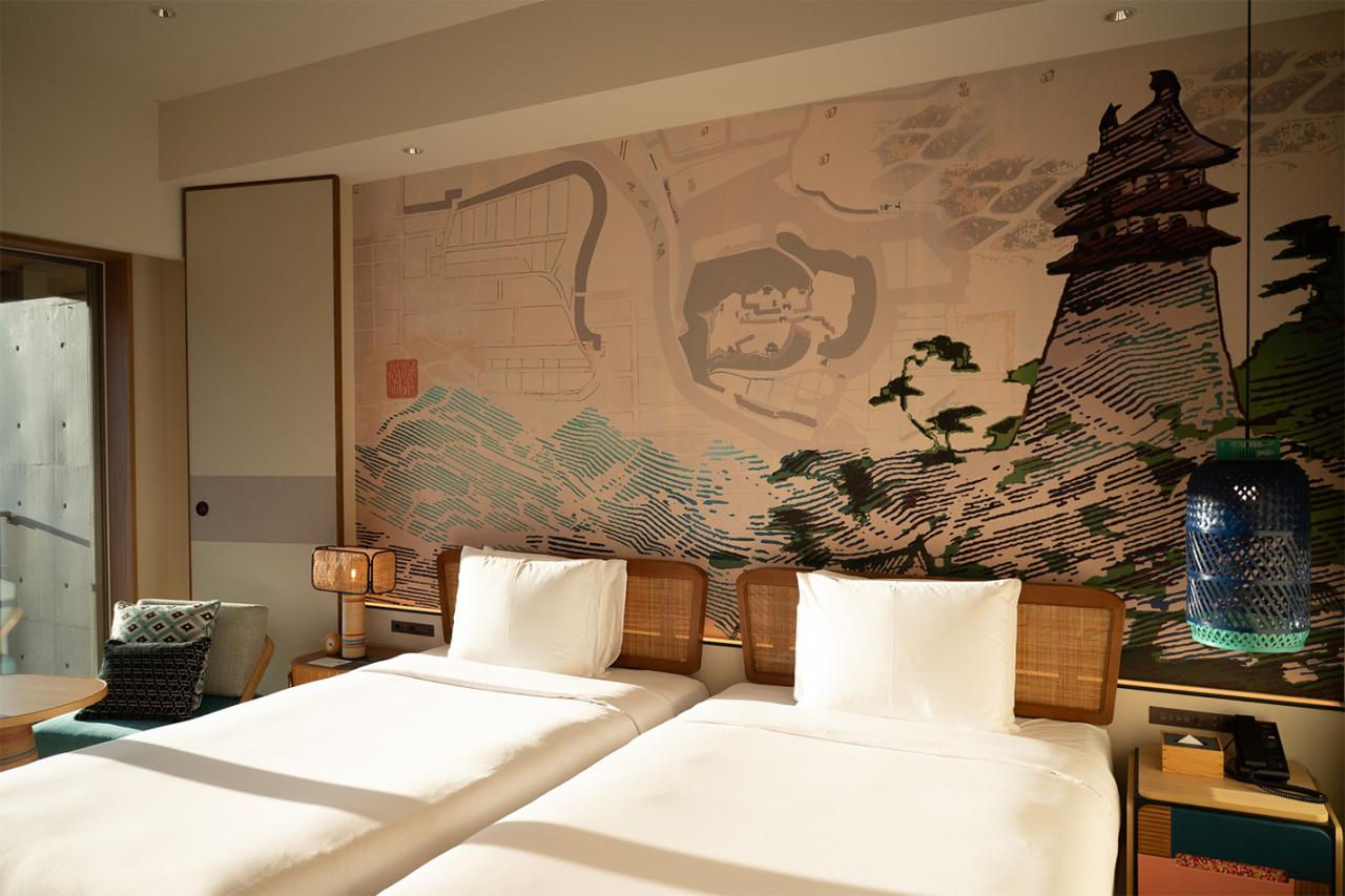 客室は木の質感と現代的なアートが調和した、犬山らしさを感じられる個性が光るデザイン。壁には犬山城と城下町の古地図のアートがあり、照明やファブリックにも地域文化を感じられるディティールが散りばめられています。