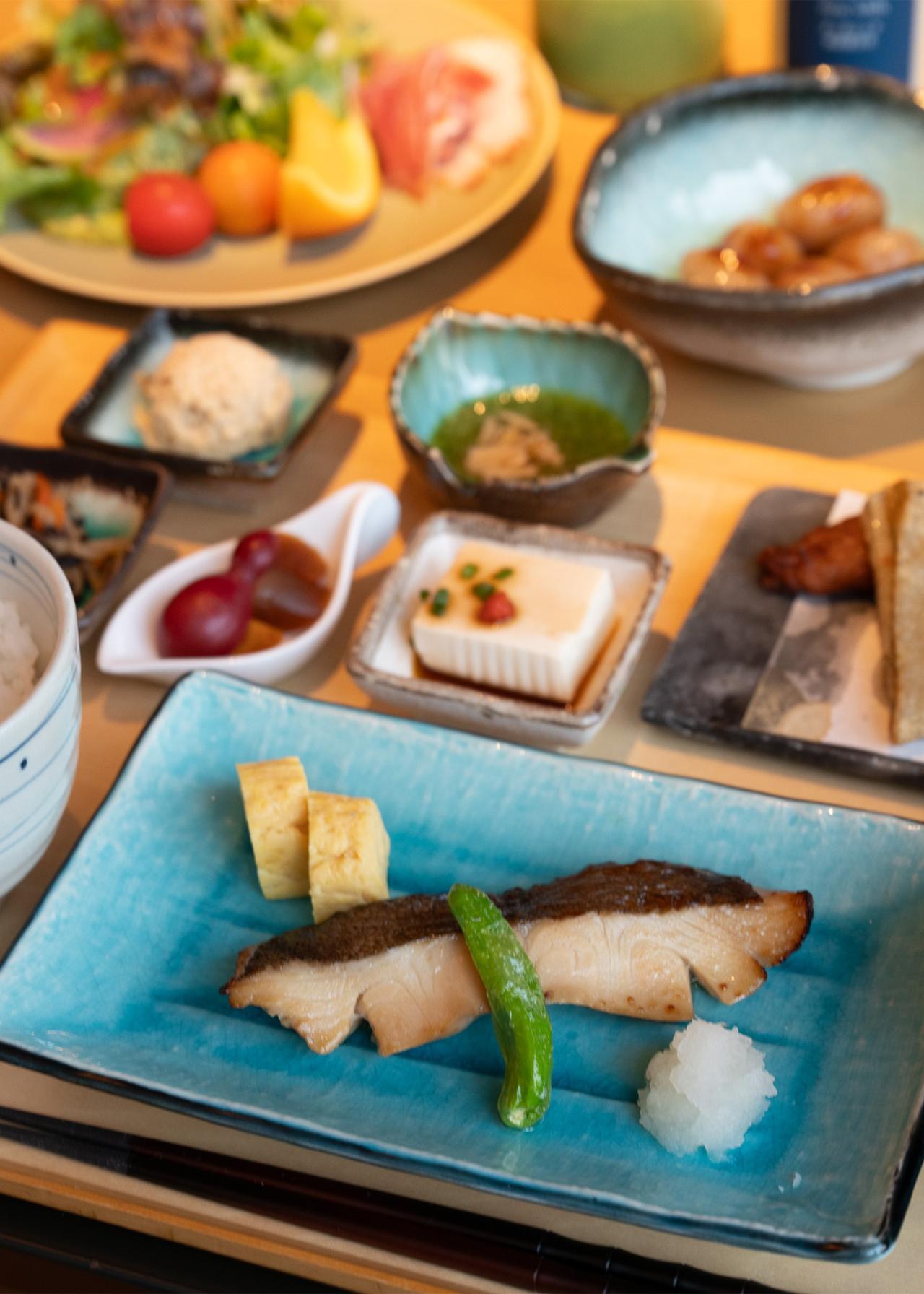 朝食のメインは、旅先の特別感をしっかり味わえる和朝食をチョイス。焼き魚、旬の小鉢、出汁の香り豊かな味噌汁など、一品ずつ丁寧に仕上げられた料理が並びます。小鉢の中には地元の野菜「守口大根」を使った漬物もあり、箸を進めるたびに“犬山の朝ごはん”を心地よく感じられます。