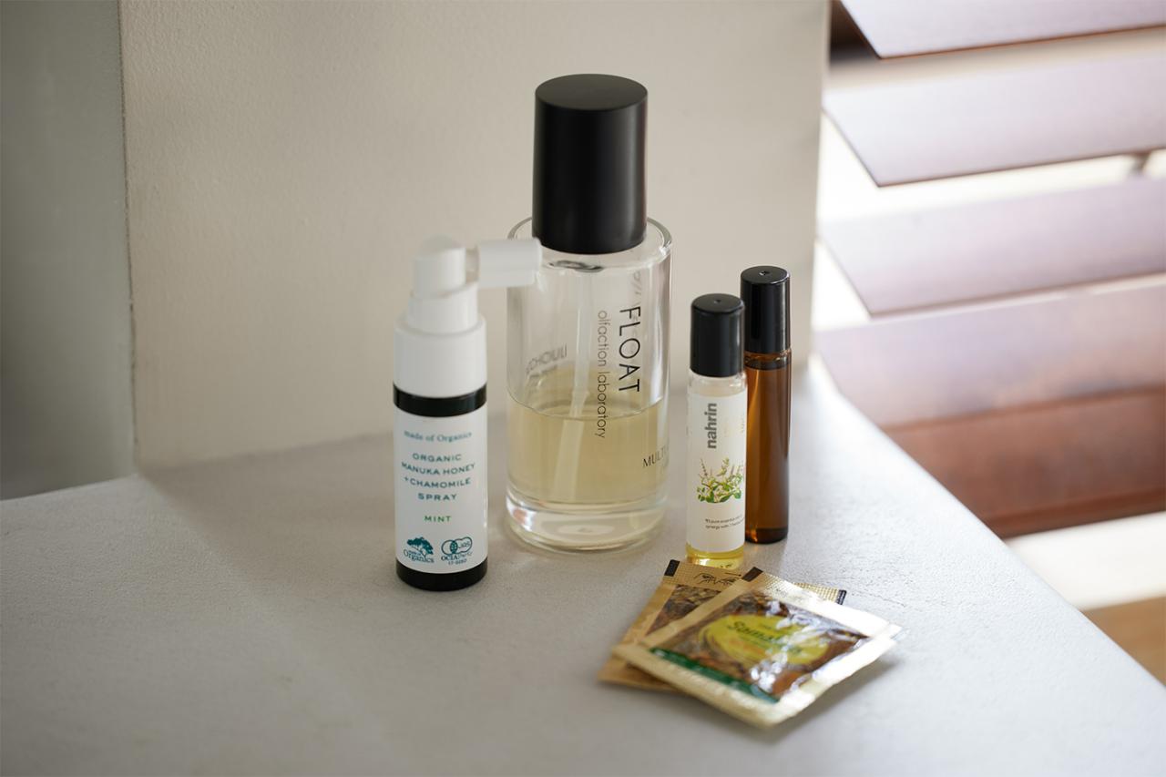 スキンケア類も少ないほうがいいので全身一緒に使えるもの。香りは、いつももち歩いているフレグランスオイル。サングラスはいつ何時も。エコバッグも、いつ何時も。森祐子さんの旅の1枚
