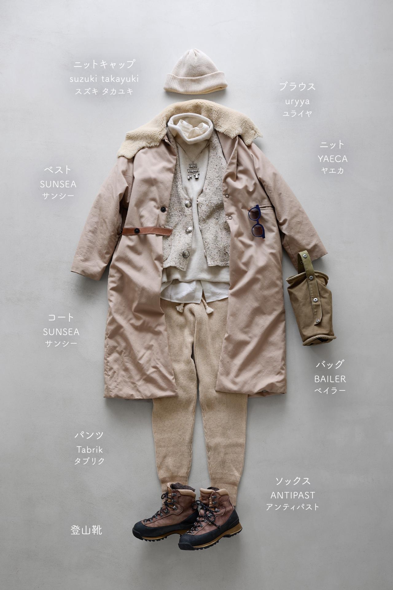 いつでも心置きなく歩いて行けて、土や水などに強くて疲れない登山靴と一緒に、メリノウールやカシミヤに包まれて動く。靴はゴアテックスで水場や雨、雪も問題なく、メリノウールとカシミヤはとにかく暖かく、シルクと重ねたミルフィーユはとにかく心地よい。夏でない限り、相当に心地よいのです。吸湿速乾に優れ、自浄的な繊維だから、涼しい季節は毎日洗濯しなくてもよいほど。これから春が巡ってくるけど、まだ忘れたくない冬と一緒にスノーホワイトな気持ちで。Q6. 旅の装いを選ぶとき、なにを一番意識しますか?