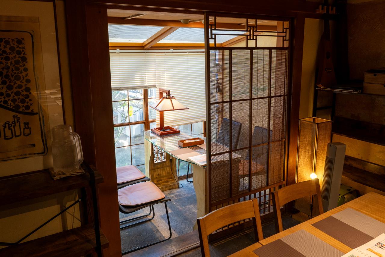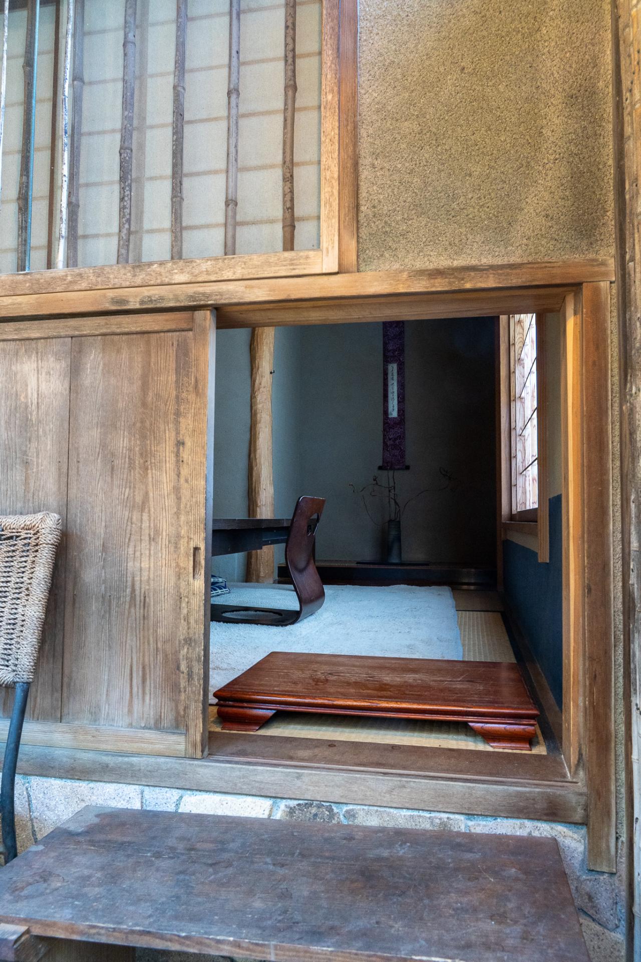 こじんまりとして居心地のよいカウンターの背中越しに廊下を抜けていくと、外に出ることができます。ベンチのある小さな「ガーデン」の先には、なんとも素敵な茶室がありました!
