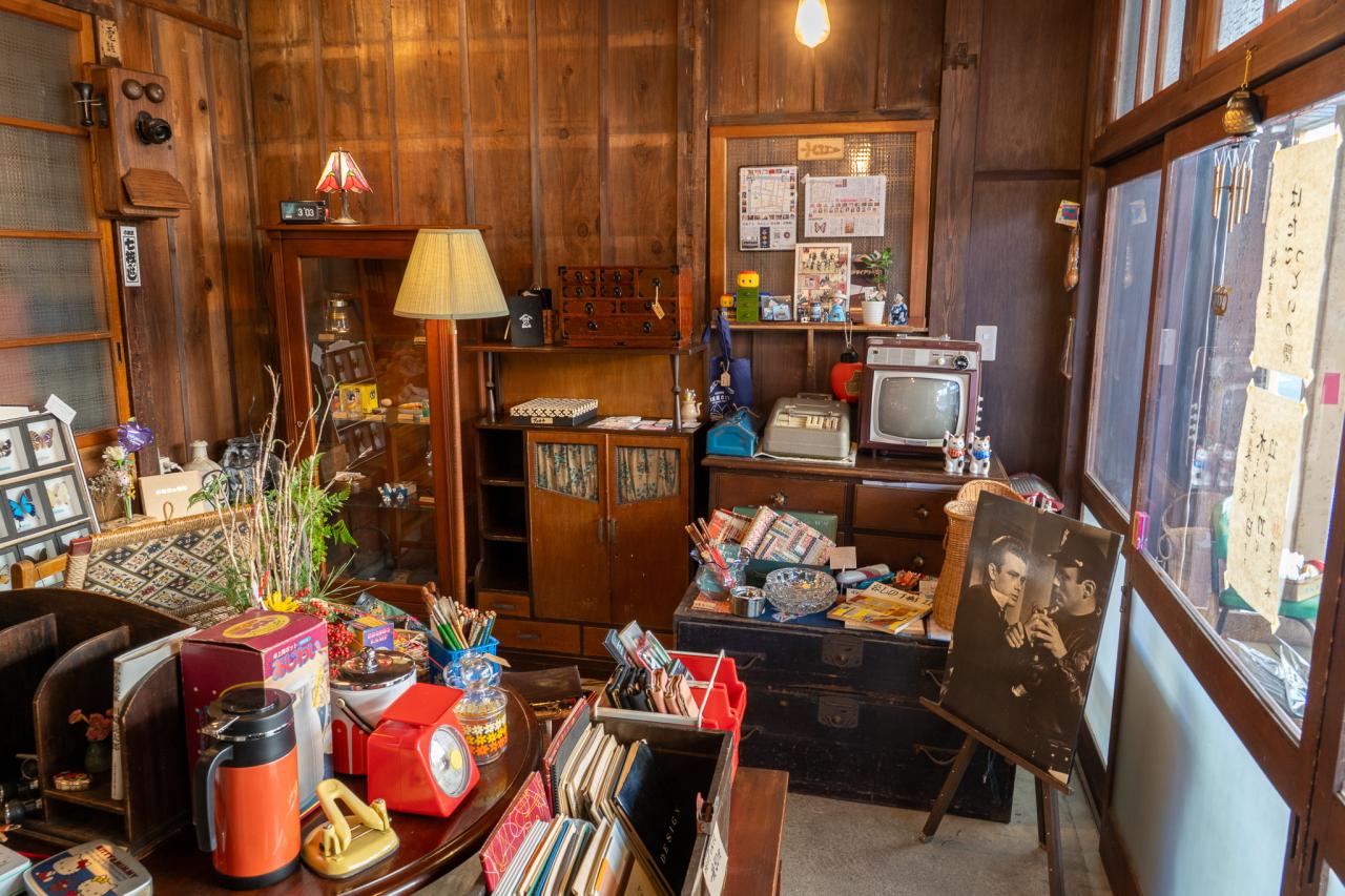 二つの客室に共用スペースのあるゲストハウススタイルの宿で、最大4名で一棟貸しもできる「旅籠屋さとう」。そのひとつのスペースとして、レトロ雑貨や家具などを販売する「はたごつどいの間」をオープンしているそうです。