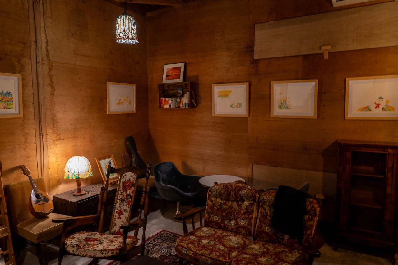 「作家応援」という意味では、地元作家の作品展示も定期的に行っているという上山さん。ギャラリースペースでもある奥の離れに案内してくれました。不思議な路地のような内廊下を歩いていくと出現したその名も「変な部屋」。こちらには素敵な家具たち(購入できます)がたくさん。手に入れた後のイメージがつきやすそうなレイアウトで嬉しいです。さらにこちらの部屋は宿泊者の「音楽・映画鑑賞スペース」としても兼ねているそうで、通りで居心地がいいわけです。