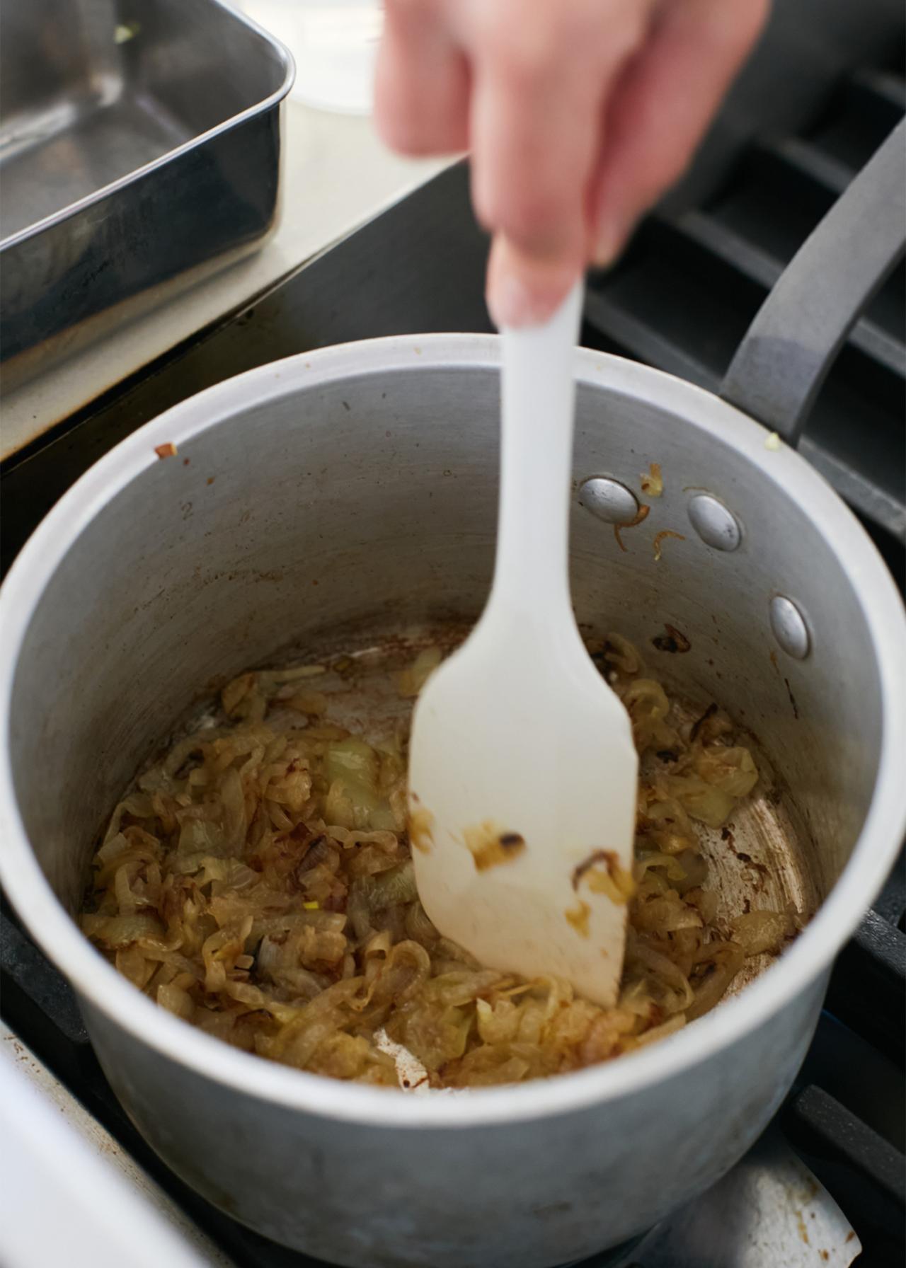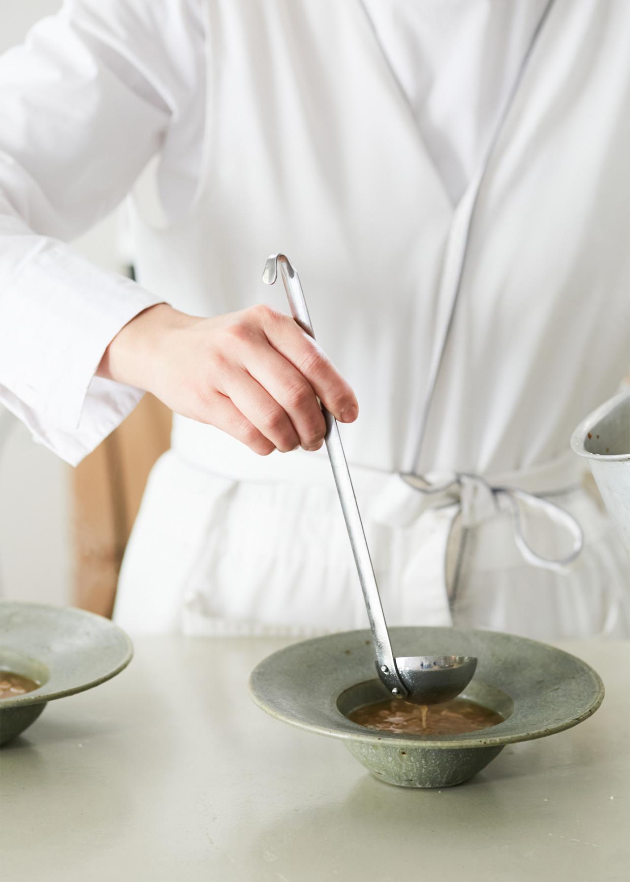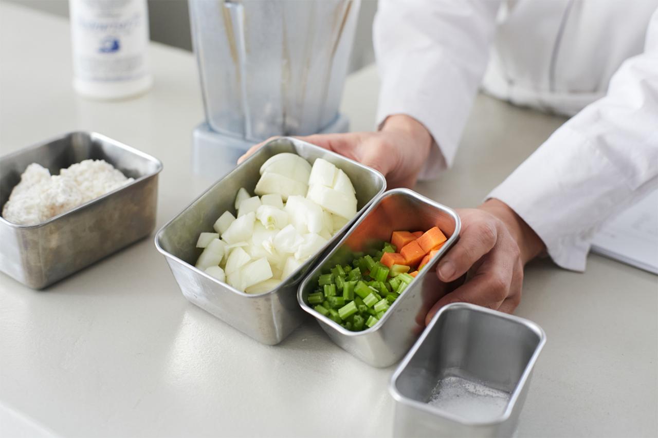 まずはコンソメ麹の作り方から。コンソメ麹とは野菜と米麹、塩だけで作られる発酵調味料のこと。作り方は意外と簡単で、玉ねぎとセロリ、にんじんをミキサーにかけたら、米麹・塩と混ぜ合わせて発酵させるだけ。消毒した清潔な容器に入れ、1日1回かき混ぜておくと、夏なら1週間ほどでコンソメ麹が完成する(気温の低い冬の場合は、10日〜2週間ほど)。野菜から出る水分を利用して発酵させるため、ご自宅で再現する場合は乾燥タイプではなく、生の米麹を使うのがポイントだ。