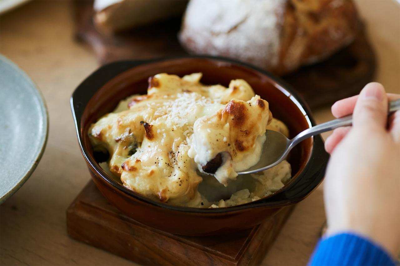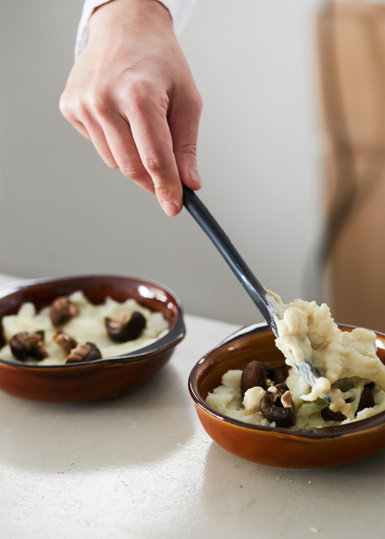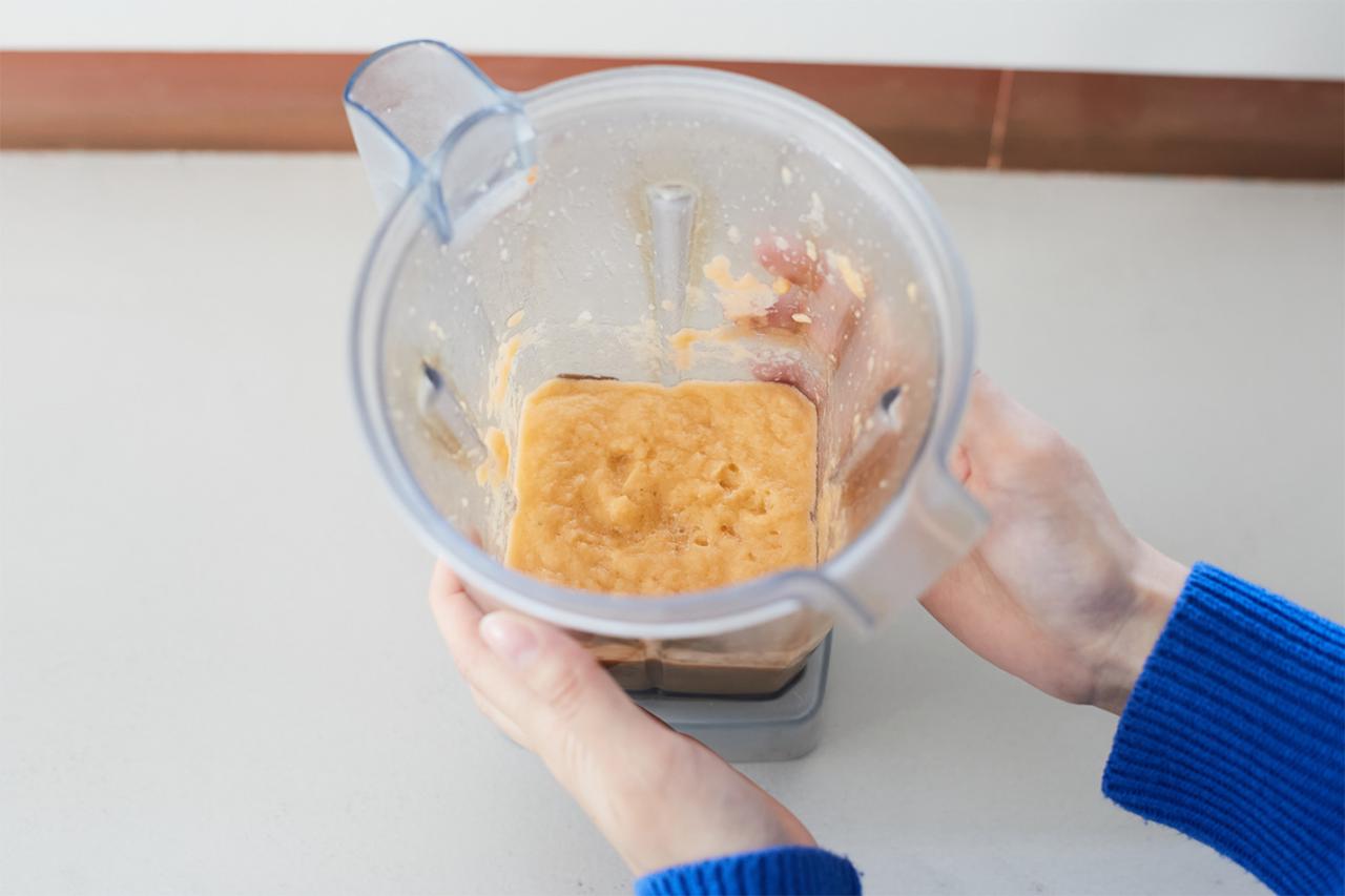 今回のレシピの中で、特に興味深かったのは、Veganチーズのレシピだ。味噌でコク、お酢でチーズの酸味を表現し、さらに白玉粉を使って“もっちり、とろり”とした食感を生み出していく。すべての材料をミキサーで攪拌したら、“チーズのようなもったり感が出るまで火にかけるだけ”という簡単さにも感動した。