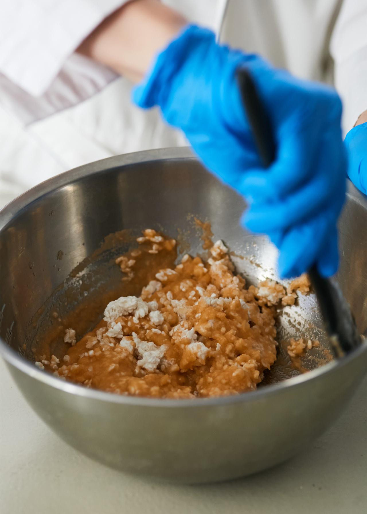 混ぜたばかりのコンソメ麹は鮮やかな色合いだが、発酵する過程で落ち着いた色味へ変化するとのこと。完成したコンソメ麹を味見させてもらうと、市販の洋風だしのようなうま味が凝縮された味わいでとてもおいしい。お肉を一切使っていないのに、ここまで奥深い味わいになるとは驚きだ。