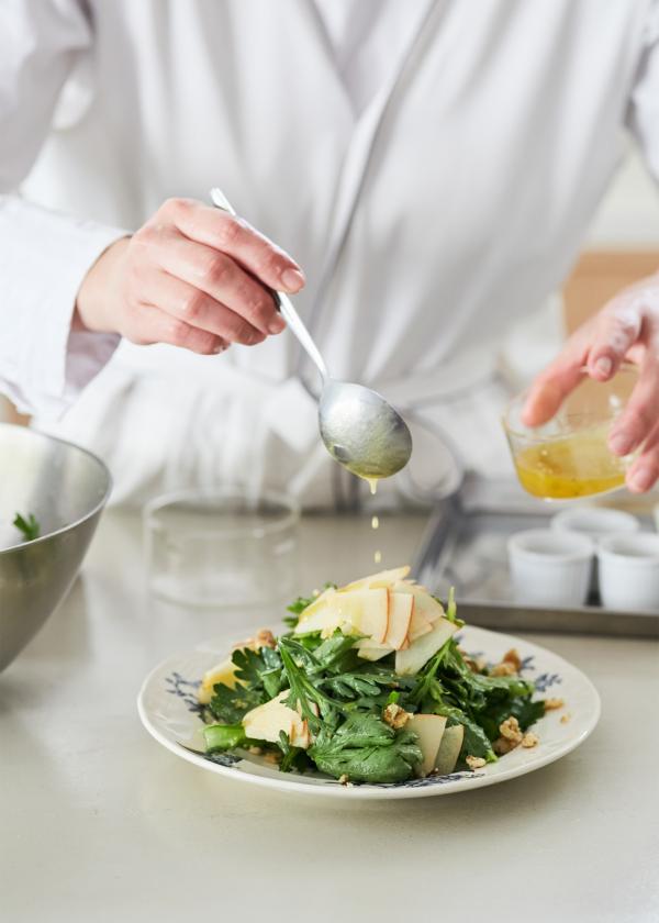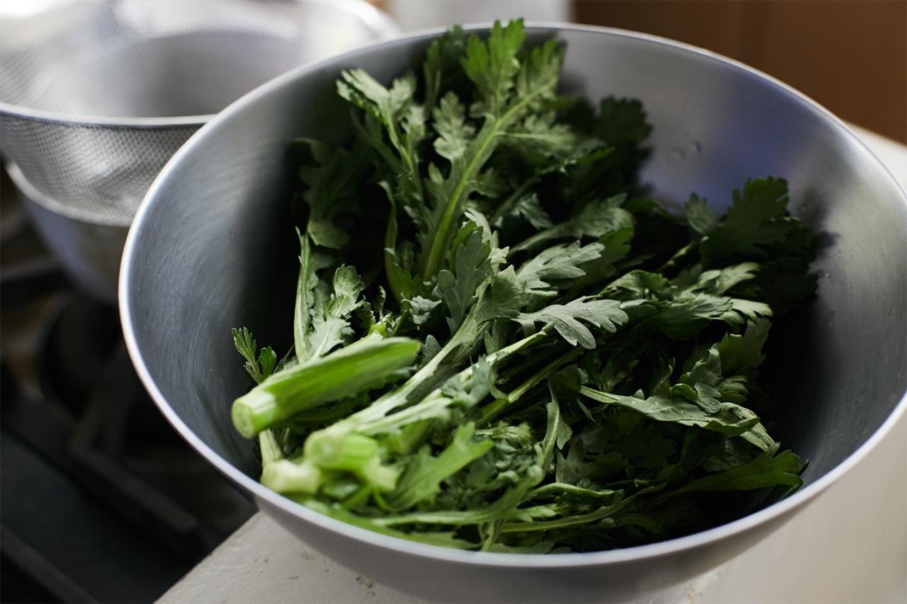 塩麹のヴィネグレットソースをかけた、春菊のサラダ。