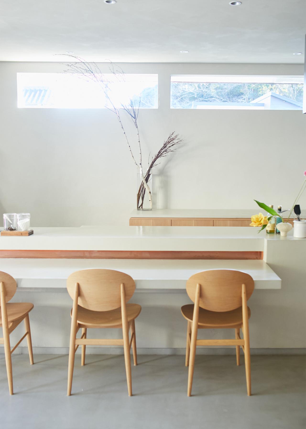 カウンター後ろには高窓が設計され、移り変わる朝比奈の景色を楽しめる。