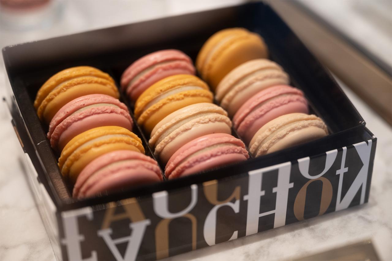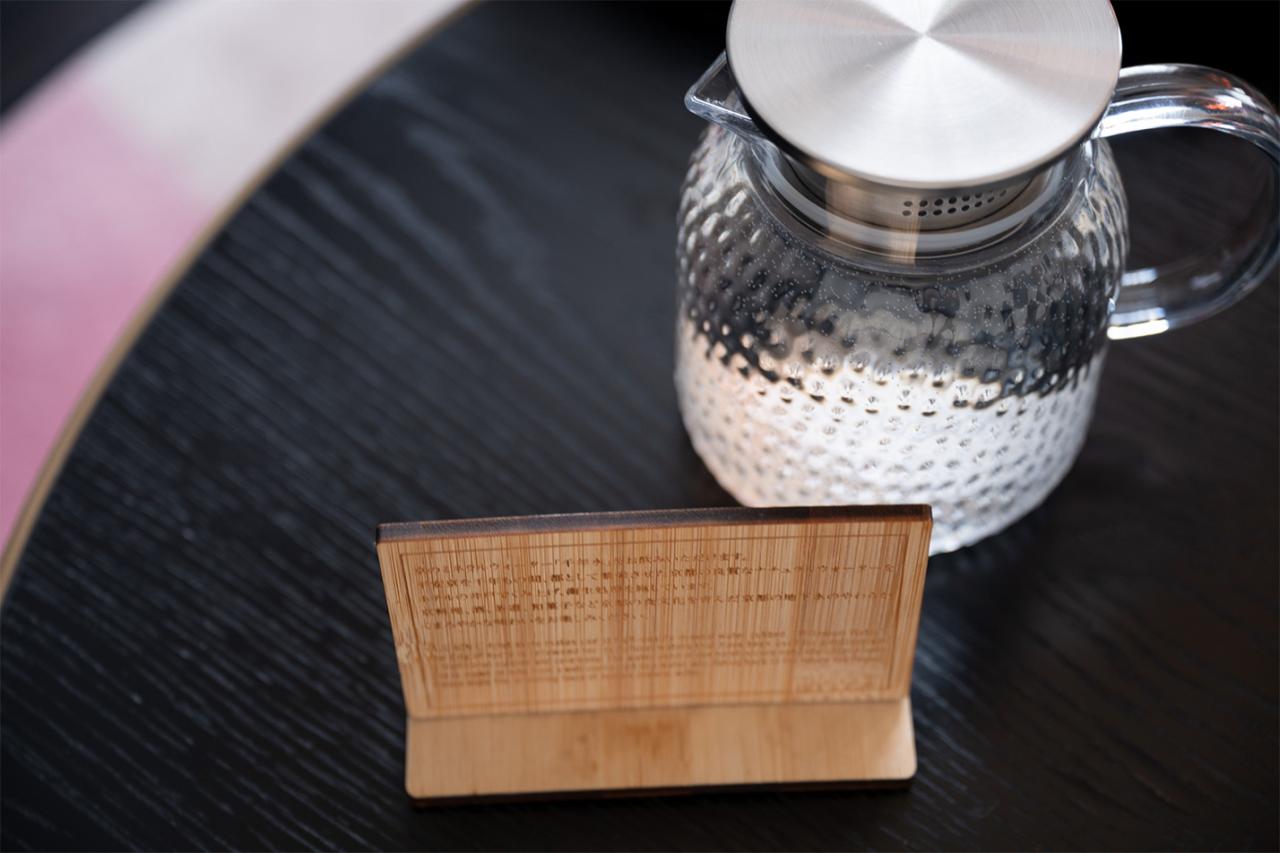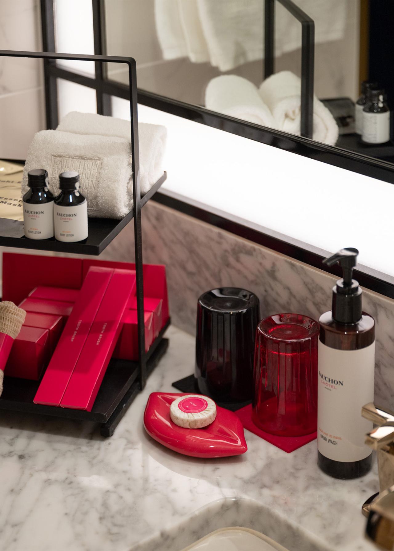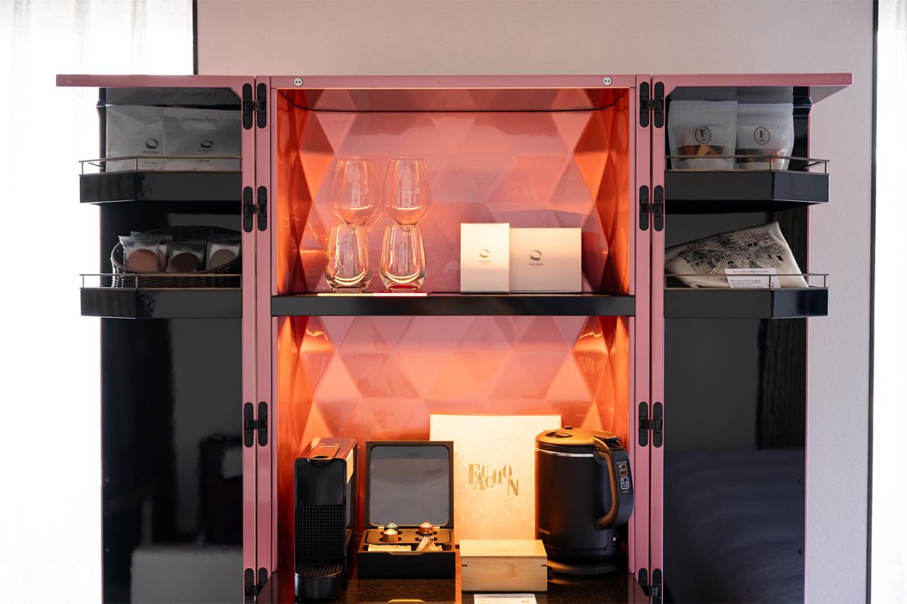 そしてこのホテル最大の魅力が、全客室に備え付けられた「グルメバー」です。ピンクのかわいい棚を開けると、フォション自慢のスイーツや紅茶がずらり。滞在中はこれらを自由に楽しめ、食べきれなかった分はオリジナルのバッグでお持ち帰りできるので、スイーツ好きにはたまりません。また、お部屋に用意されているミネラルウォーターは、ホテルの井戸から汲み上げている「千年水」。なめらかでまろやかな味わいで、紅茶などにもぴったりです。お部屋の蛇口から出てくる水をポットに汲んで利用できるので、サステナブルなところもポイントが高いです。