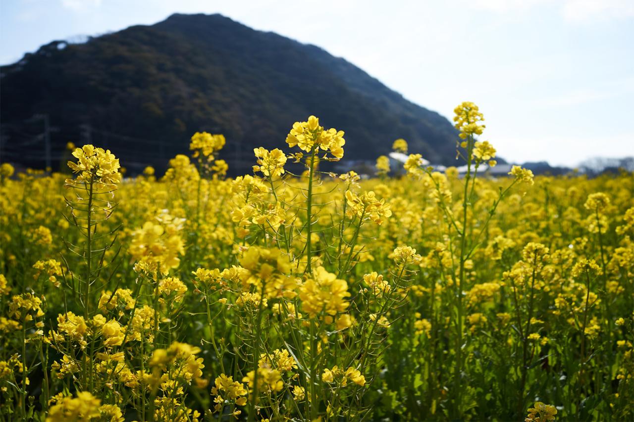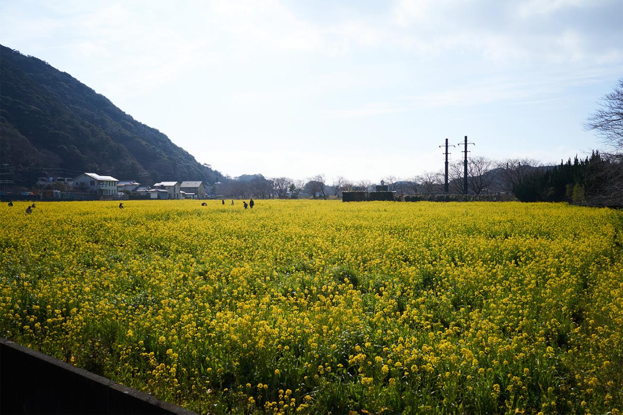 下流に向かって少し歩いていくと、大きな菜の花畑に到着しました。ここ日野(ひんの)地区には、約3万平方メートルの広大な休耕田を利用した菜の花畑があり、黄色い花が遠くまで広がっています。