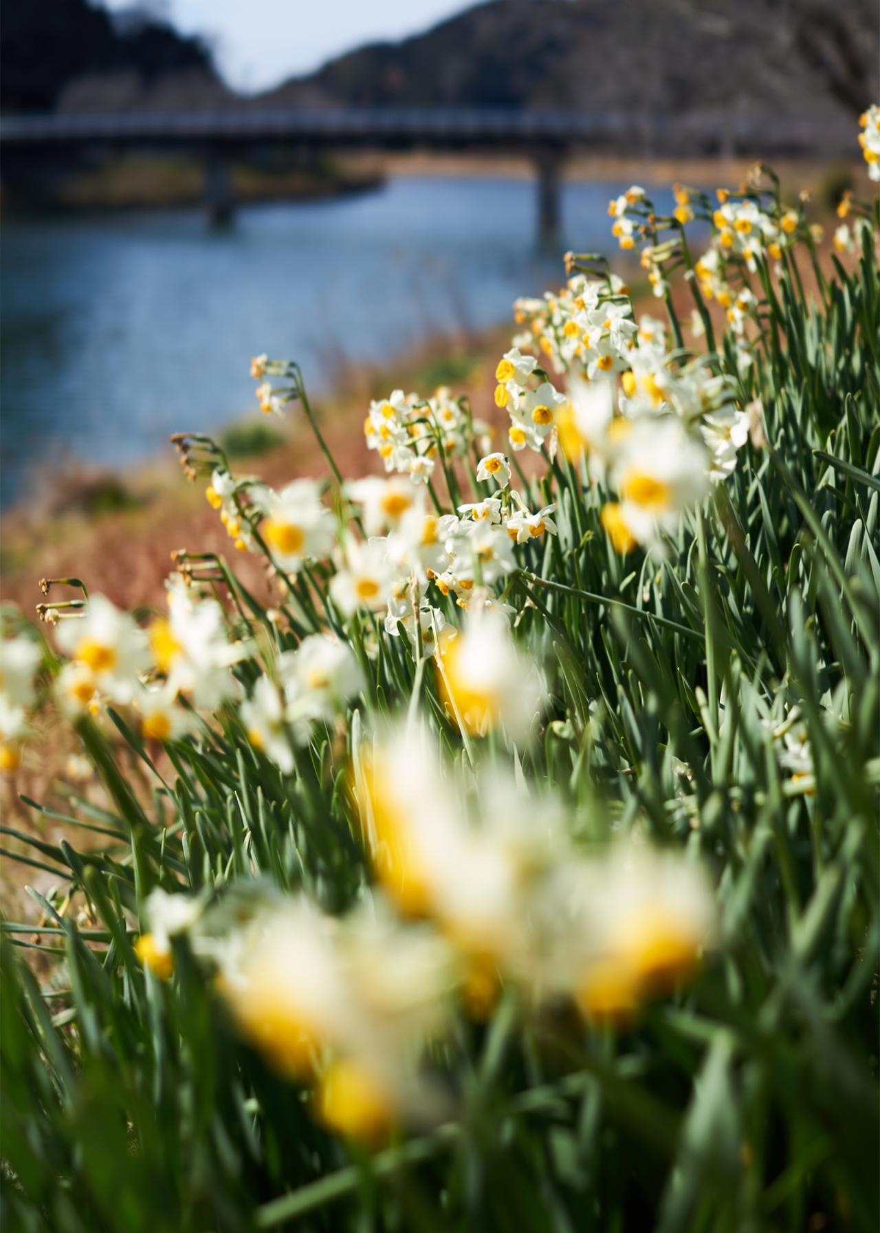 堤防沿いにも菜の花が自生していて、桜の「ピンク」と菜の花の「黄色」、そのコントラストが美しいです。菜の花畑は密度が高く、圧倒的なボリューム感。畑の中には散策路もあって、花に囲まれながら歩くことができました。