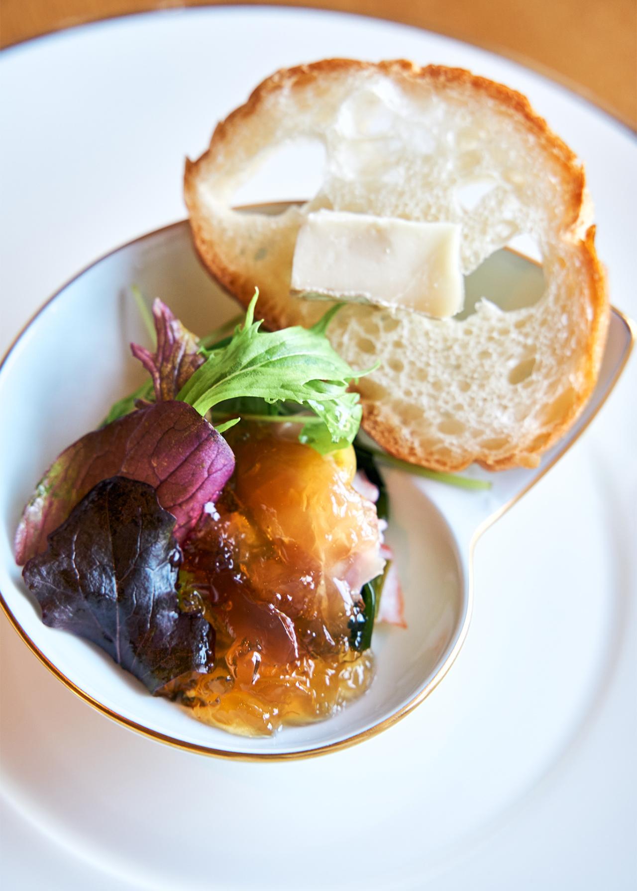 ビビッときたアイデアを逃さず、柔軟に取り入れるのが大参さん。前菜に登場した「魚介とスペイン産生ハムの和風ジュレ仕立て」は、イタリアンレストランでヒントを得て作った、大参さんの定番レシピだ。「和風ジュレなら、老若男女誰でも食べられる。幅広い層のお客様がいらっしゃるこの店にぴったりです」。使われる魚介は、三河湾直送の新鮮なもの。ジュレや野菜、生ハムと共に、さっぱりといただける。