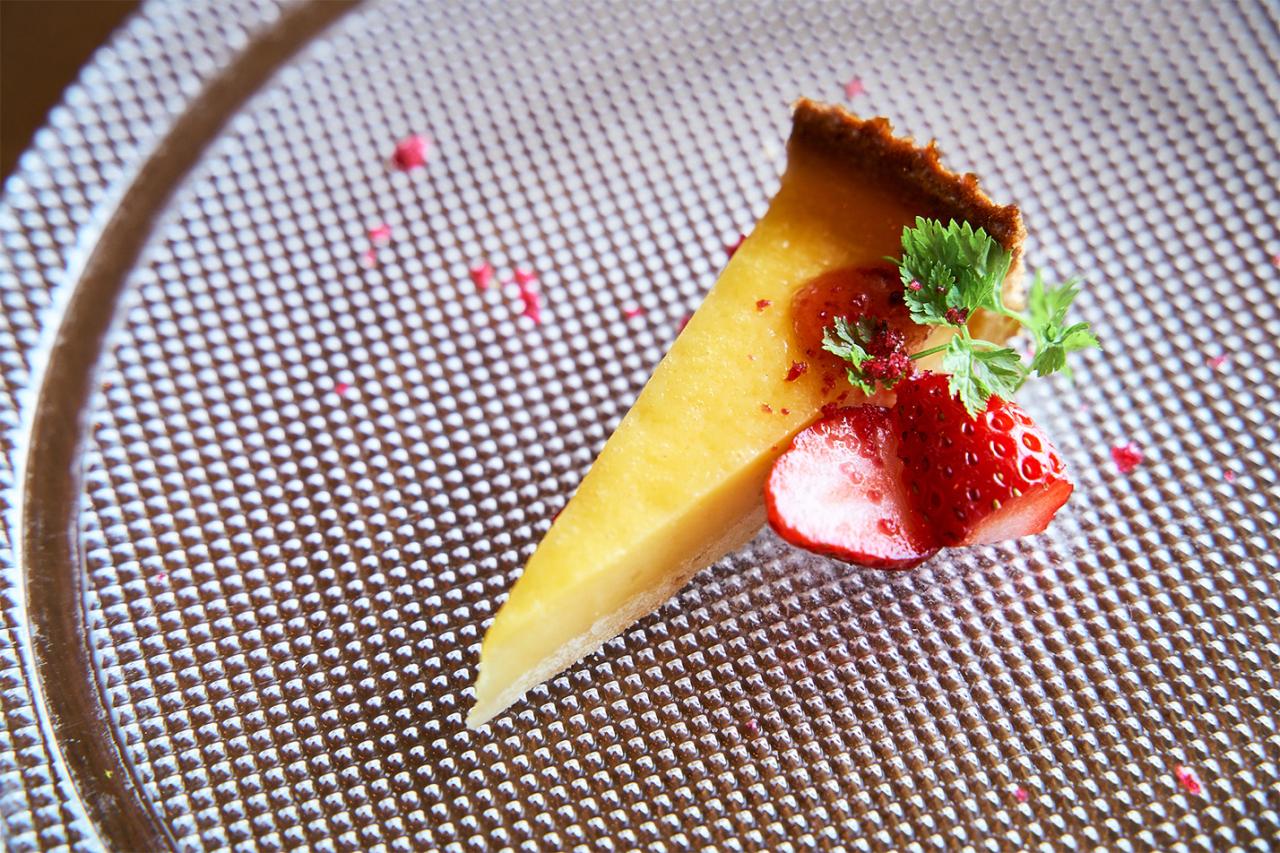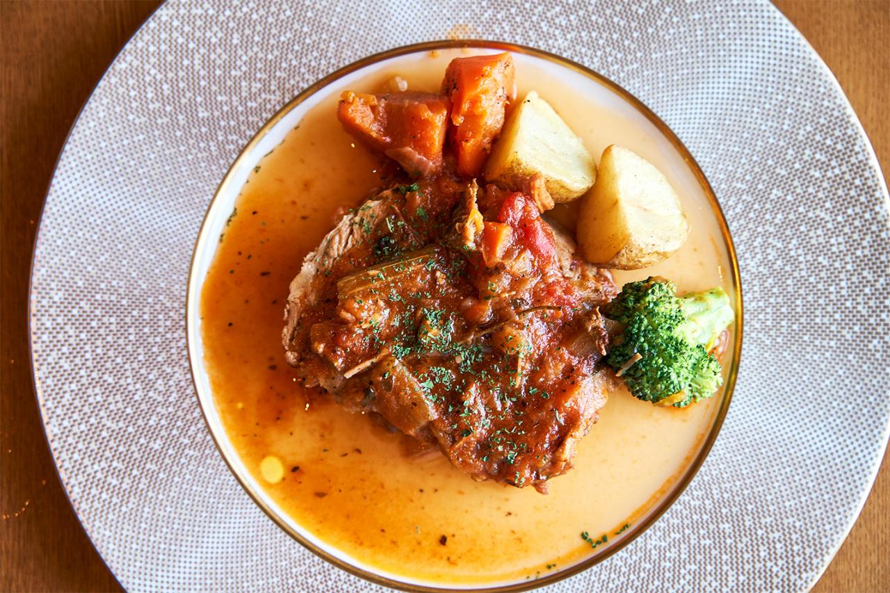 この日のランチに登場した、「ポーク肩ロースのラグー、トマト仕立て」も、食べ歩きでインスピレーションを受けた料理の一つ。「肩ロースを塊で煮込み、輪切りで提供する豪快な料理に出会ったときは衝撃でした。すぐに自分でも作ってみて、今では自慢の一品です。豚肉は手間暇かければおいしくなる。この豚は、ミルポワ(さいの目に切った香味野菜)やハーブと共に3時間半かけて煮込んでいるんですよ」。ほろほろとほどけるような柔らかい肉質に、旨味がたっぷり出たソース。会話を楽しみつつ、じっくりといただきたい。